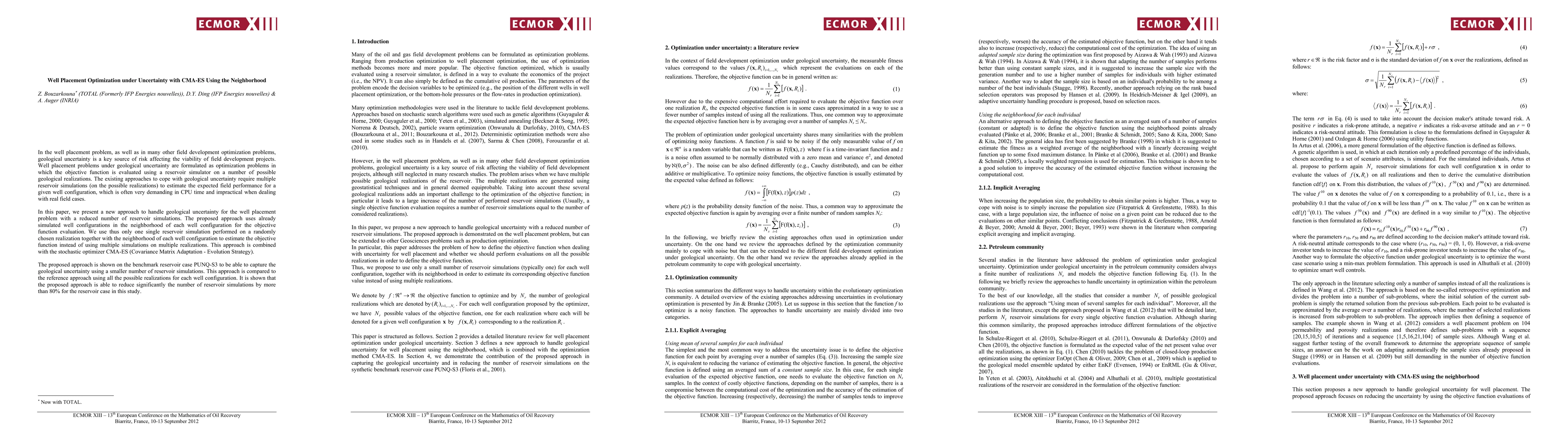 This paper proposes a method to optimize well placement under geological uncertainty using a reduced number of reservoir simulations, leveraging the neighborhood of well configurations and the CMA-ES optimizer. The approach significantly decreases the number of required simulations (around 80%) while still capturing geological uncertainty, demonstrated on the PUNQ-S3 benchmark case.