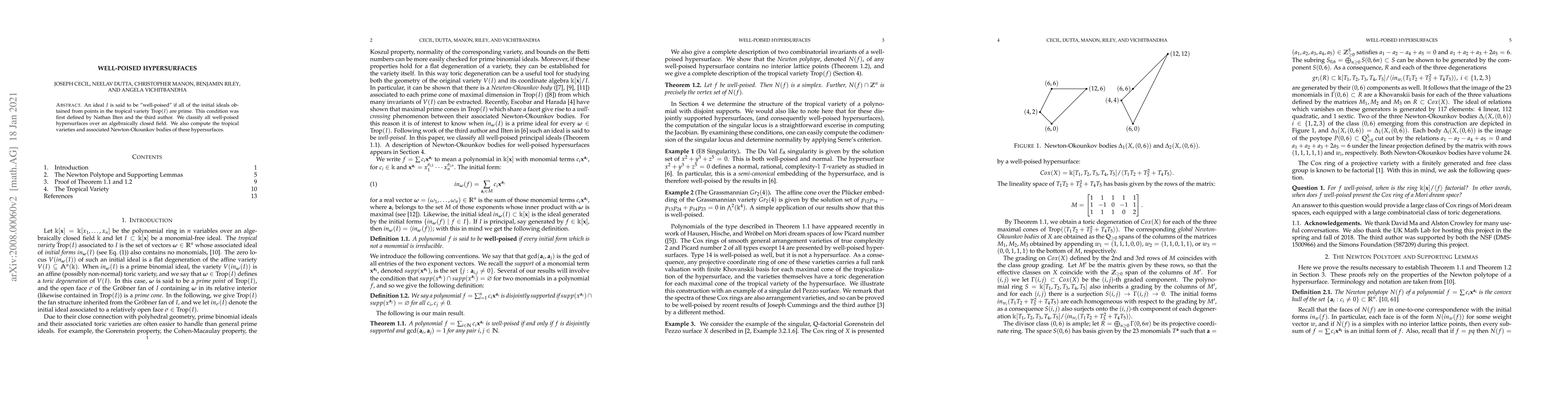 The research classifies well-poised hypersurfaces over an algebraically closed field, studying their tropical varieties and associated Newton-Okounkov bodies.