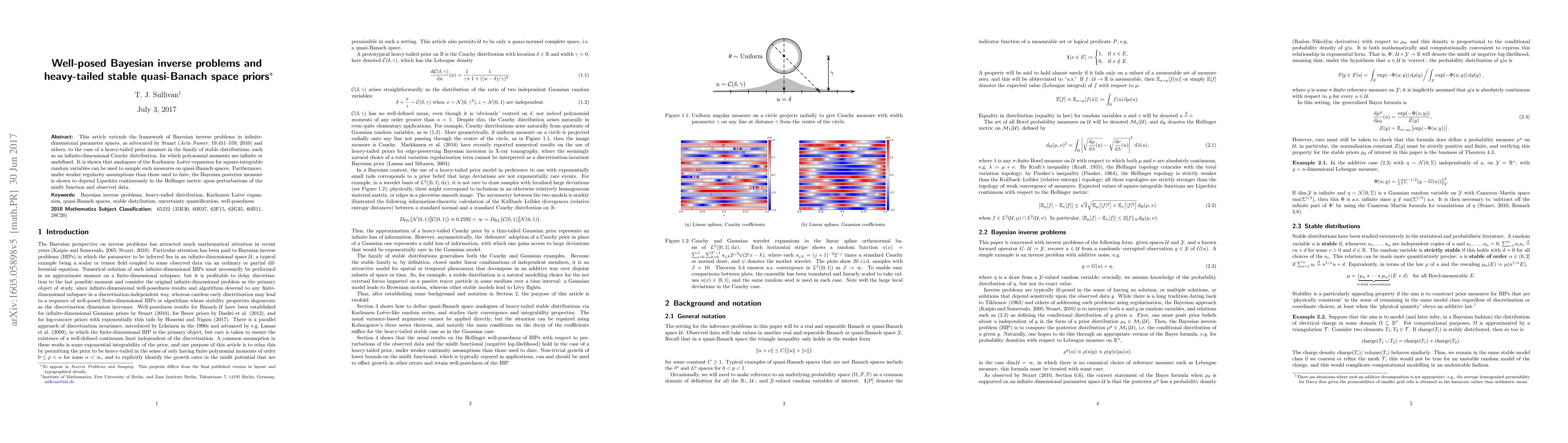 This article extends the framework of Bayesian inverse problems in infinite-dimensional parameter spaces, as advocated by Stuart (Acta Numer. 19:451--559, 2010) and others, to the case of a heavy-tailed prior measure in the family of stable distributions, such as an infinite-dimensional Cauchy distribution, for which polynomial moments are infinite or undefined. It is shown that analogues of the Karhunen--Lo\`eve expansion for square-integrable random variables can be used to sample such measures on quasi-Banach spaces. Furthermore, under weaker regularity assumptions than those used to date, the Bayesian posterior measure is shown to depend Lipschitz continuously in the Hellinger metric upon perturbations of the misfit function and observed data.