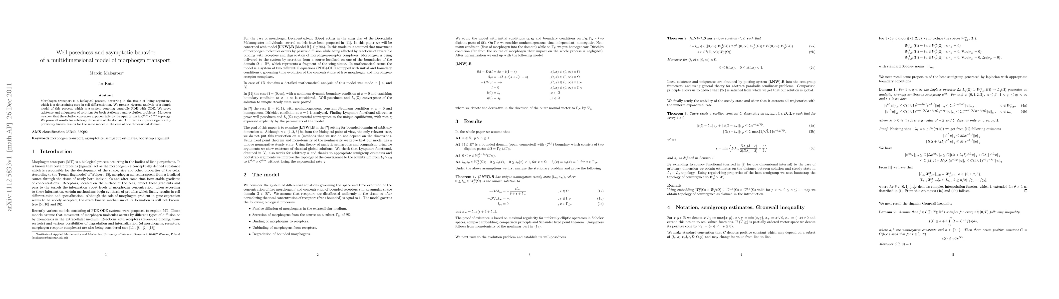 Morphogen transport is a biological process, occurring in the tissue of living organisms, which is a determining step in cell differentiation. We present rigorous analysis of a simple model of this process, which is a system coupling parabolic PDE with ODE. We prove existence and uniqueness of solutions for both stationary and evolution problems. Moreover we show that the solution converges exponentially to the equilibrium in $C^1\times C^0$ topology. We prove all results for arbitrary dimension of the domain. Our results improve significantly previously known results for the same model in the case of one dimensional domain.