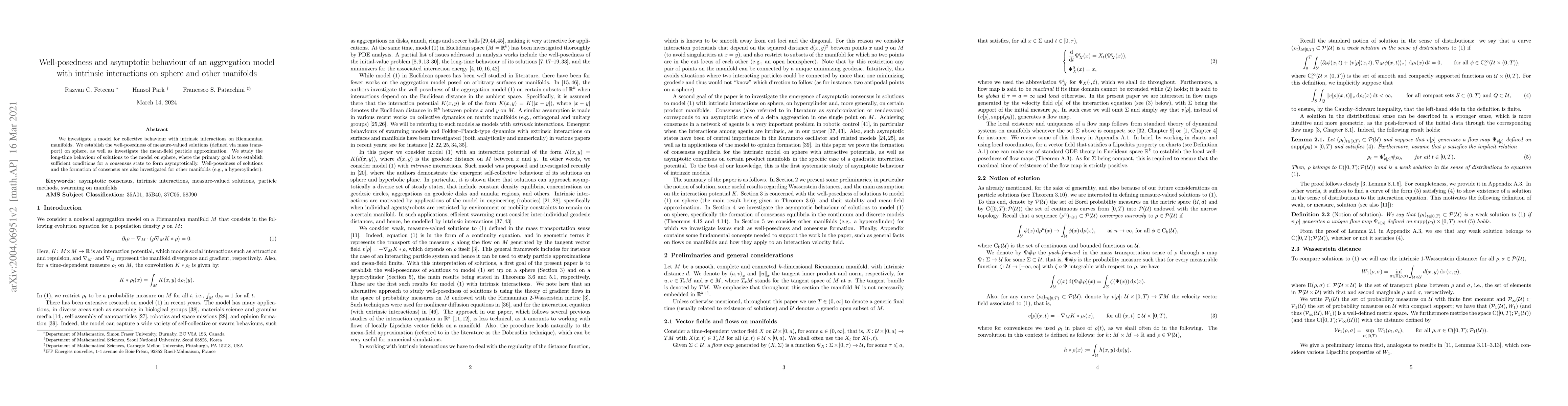 We investigate a model for collective behaviour with intrinsic interactions on Riemannian manifolds. We establish the well-posedness of measure solutions (defined via mass transport) on sphere, as well as investigate the mean-field particle approximation. We study the long-time behaviour of solutions to the model on sphere, where the primary goal is to establish sufficient conditions for a consensus state to form asymptotically. Well-posedness of solutions and the formation of consensus are also investigated for other manifolds (e.g., a hypercylinder).