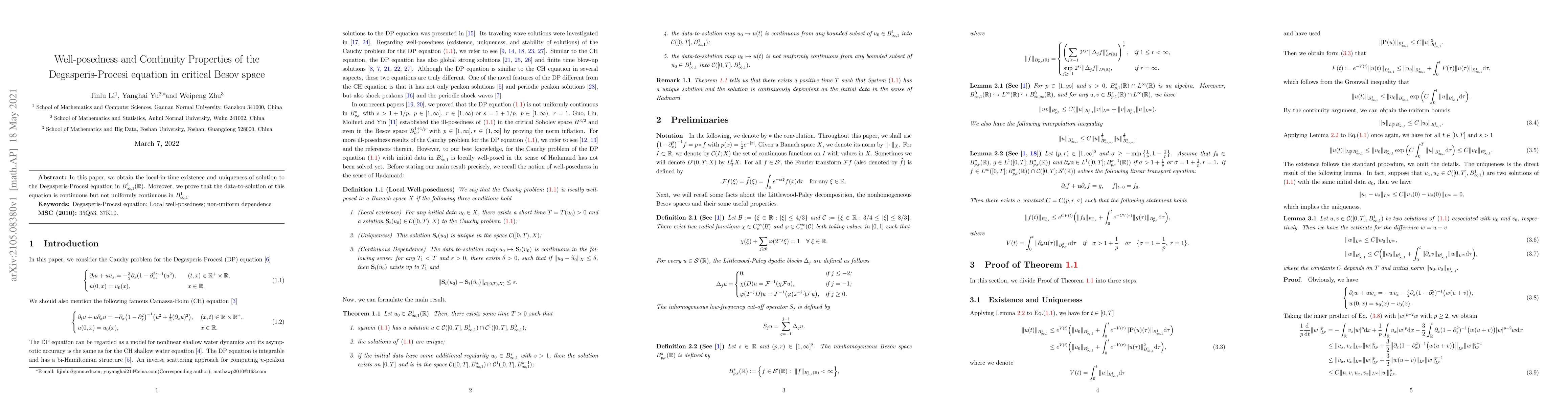 This paper establishes local-in-time existence and uniqueness of solutions to the Degasperis-Procesi equation in the critical Besov space $B^1_{\infty,1}(\R)$. It also demonstrates continuity of the data-to-solution map, though not uniformly.