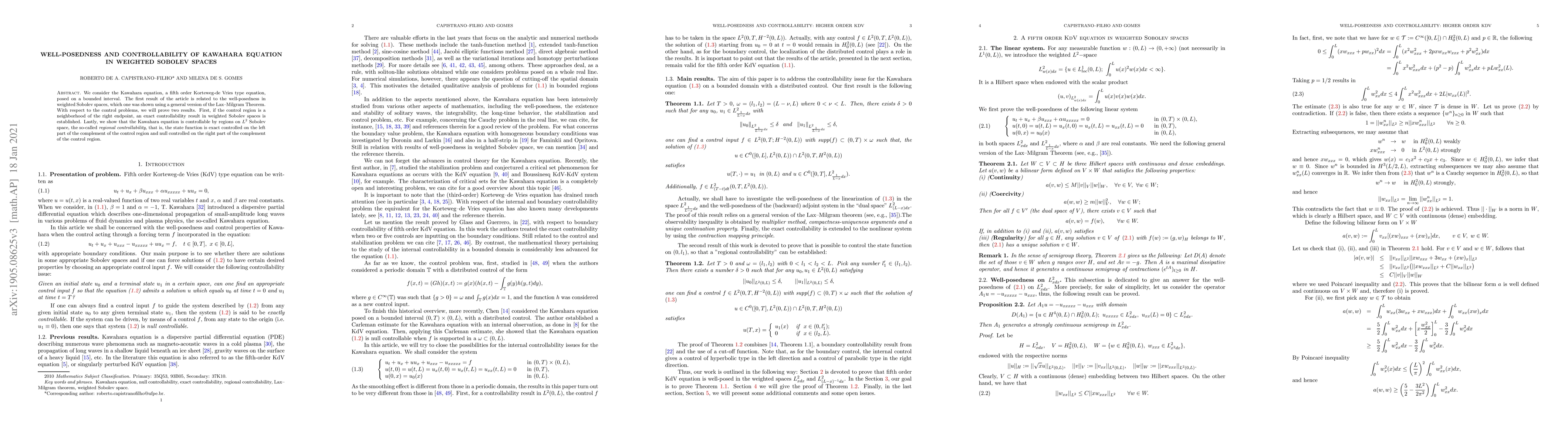 We consider the Kawahara equation, a fifth order Korteweg-de Vries type equation, posed on a bounded interval. The first result of the article is related to the well-posedness in weighted Sobolev spaces, which one was shown using a general version of the Lax--Milgram Theorem. With respect to the control problems, we will prove two results. First, if the control region is a neighborhood of the right endpoint, an exact controllability result in weighted Sobolev spaces is established. Lastly, we show that the Kawahara equation is controllable by regions on $L^2$ Sobolev space, the so-called regional controllability, that is, the state function is exact controlled on the left part of the complement of the control region and null controlled on the right part of the complement of the control region.
