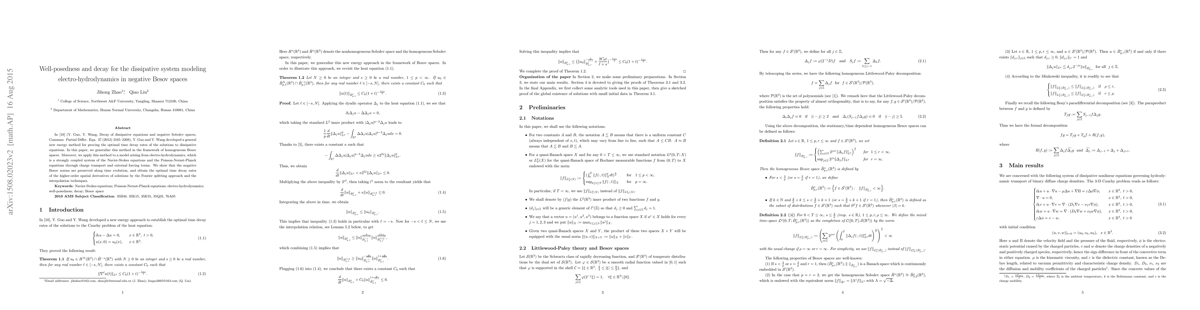 In \cite{GW12} (Y. Guo, Y. Wang, Decay of dissipative equations and negative Sobolev spaces, Commun. Partial Differ. Equ. 37 (2012) 2165--2208), Y. Guo and Y. Wang developed a general new energy method for proving the optimal time decay rates of the solutions to dissipative equations. In this paper, we generalize this method in the framework of homogeneous Besov spaces. Moreover, we apply this method to a model arising from electro-hydrodynamics, which is a coupled system of the Navier-Stokes equations and the Poisson-Nernst-Planck equations through charge transport and external forcing terms. We show that the negative Besov norms are preserved along time evolution, and obtain the optimal temporal decay rates of the higher-order spatial derivatives of solutions by the Fourier splitting approach and the interpolation techniques.