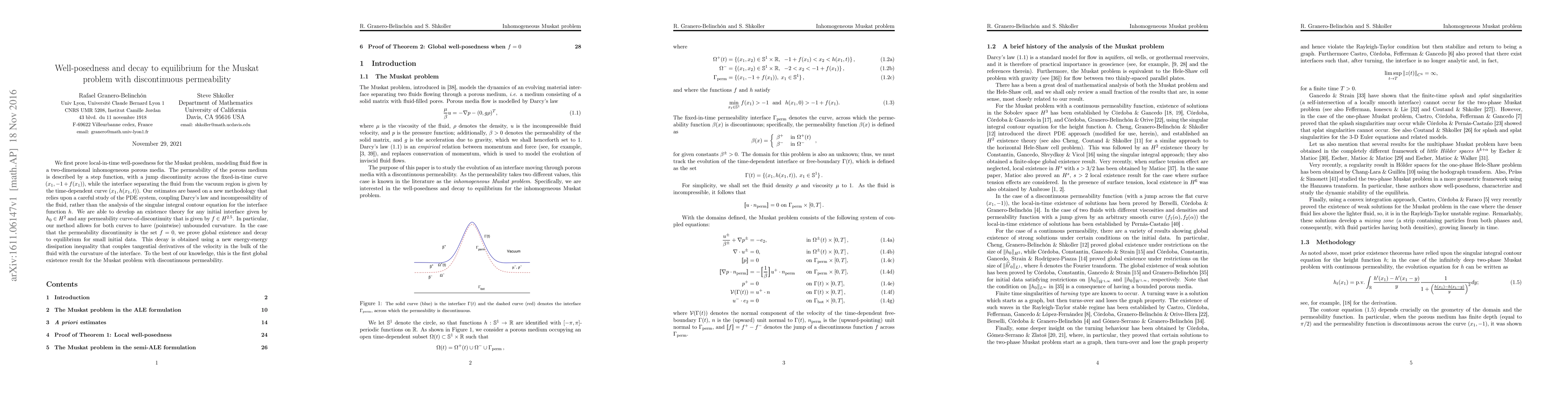We first prove local-in-time well-posedness for the Muskat problem, modeling fluid flow in a two-dimensional inhomogeneous porous media. The permeability of the porous medium is described by a step function, with a jump discontinuity across the fixed-in-time curve $(x_1,-1+f(x_1))$, while the interface separating the fluid from the vacuum region is given by the time-dependent curve $(x_1,h(x_1,t))$. Our estimates are based on a new methodology that relies upon a careful study of the PDE system, coupling Darcy's law and incompressibility of the fluid, rather than the analysis of the singular integral contour equation for the interface function $h$. We are able to develop an existence theory for any initial interface given by $h_0 \in H^2$ and any permeability curve-of-discontinuity that is given by $f \in H^{2.5}$. In particular, our method allows for both curves to have (pointwise) unbounded curvature. In the case that the permeability discontinuity is the set $f=0$, we prove global existence and decay to equilibrium for small initial data. This decay is obtained using a new energy-energy dissipation inequality that couples tangential derivatives of the velocity in the bulk of the fluid with the curvature of the interface. To the best of our knowledge, this is the first global existence result for the Muskat problem with discontinuous permeability.