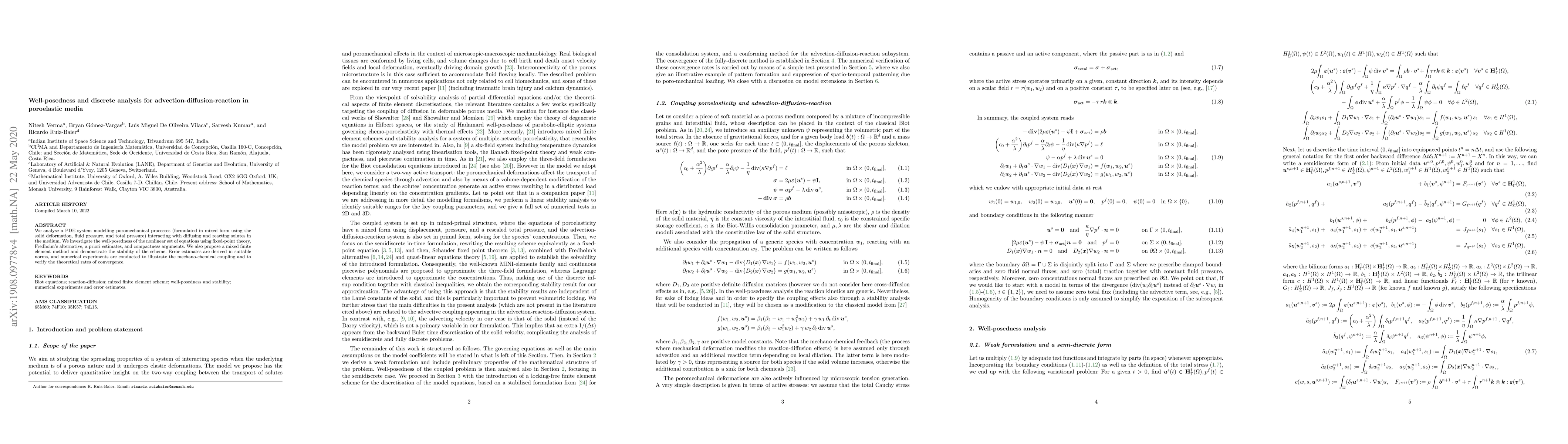 We analyse a PDE system modelling poromechanical processes (formulated in mixed form using the solid deformation, fluid pressure, and total pressure) interacting with diffusing and reacting solutes in the medium. We investigate the well-posedness of the nonlinear set of equations using fixed-point theory, Fredholm's alternative, a priori estimates, and compactness arguments. We also propose a mixed finite element method and rigorously demonstrate the stability of the scheme. Error estimates are derived in suitable norms, and numerical experiments are conducted to illustrate the mechano-chemical coupling and to verify the theoretical rates of convergence.