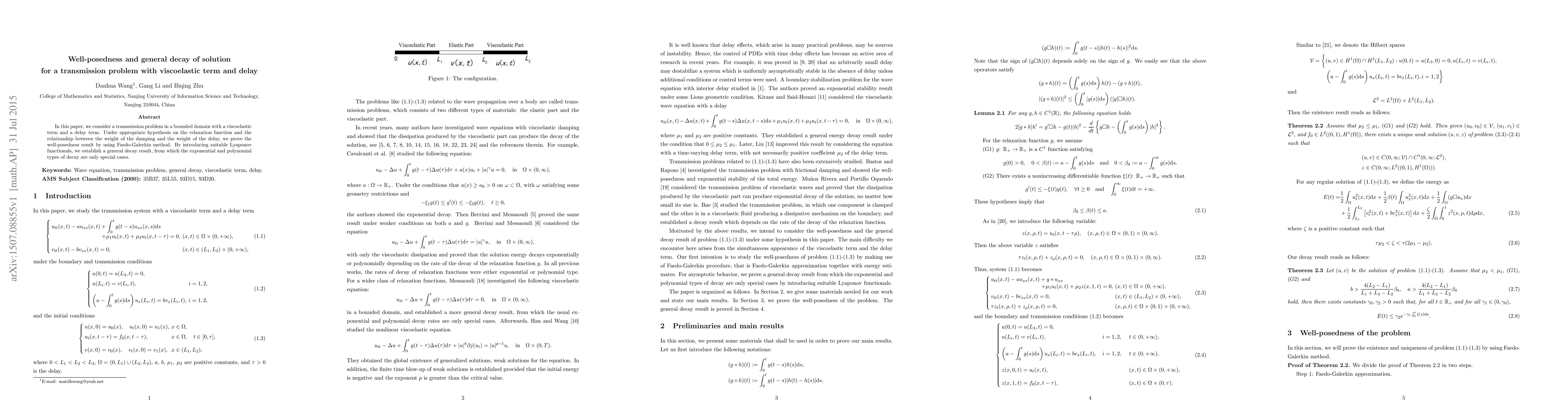 This paper investigates a transmission problem featuring a viscoelastic term and a delay term, proving well-posedness via the Faedo-Galerkin method and establishing general decay of the solution using Lyapunov functionals, encompassing both exponential and polynomial decay types.