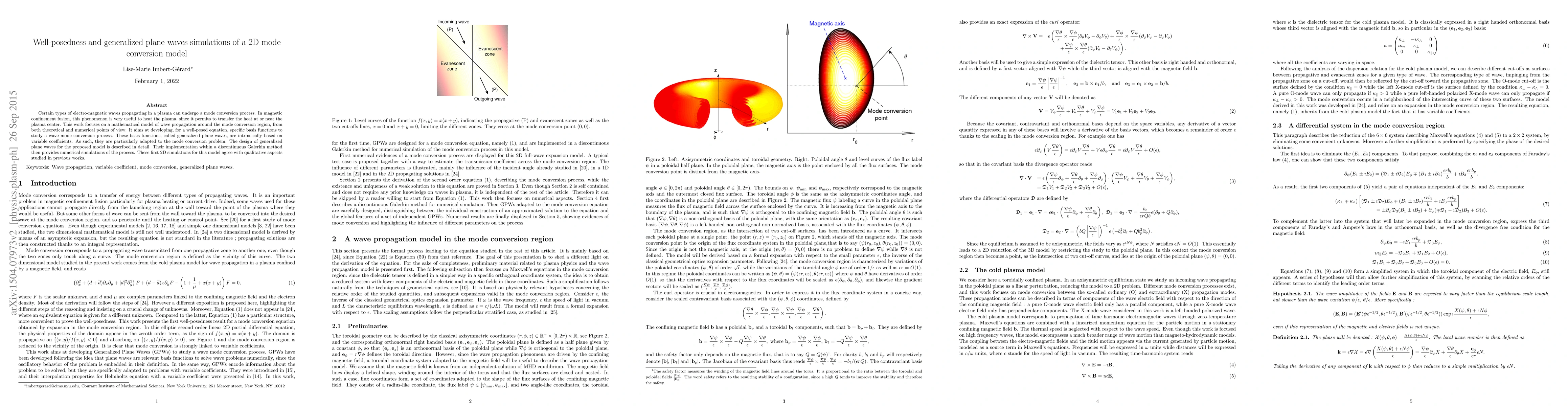 This paper develops a mathematical model for electromagnetic wave mode conversion in plasma, focusing on theoretical and numerical aspects. It introduces generalized plane waves with variable coefficients, implemented via a discontinuous Galerkin method, to simulate the mode conversion process, yielding 2D simulations consistent with prior qualitative studies.