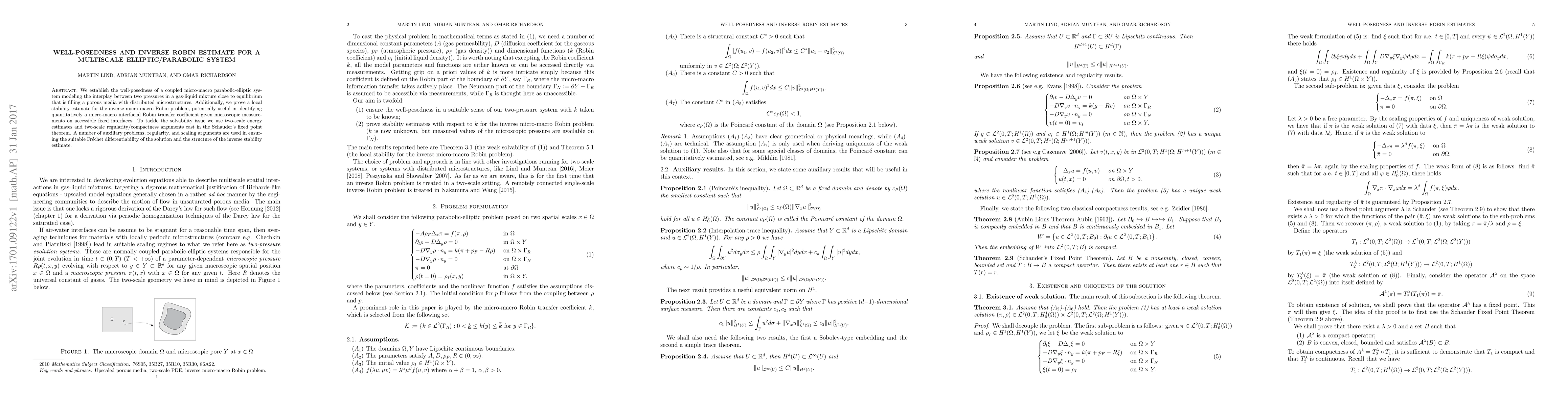 This paper establishes the well-posedness of a coupled micro-macro parabolic-elliptic system modeling gas-liquid mixtures in porous media, and proves a local stability estimate for the inverse Robin problem to identify micro-macro interfacial transfer coefficients. The analysis employs two-scale methods and Schauder's fixed point theorem.