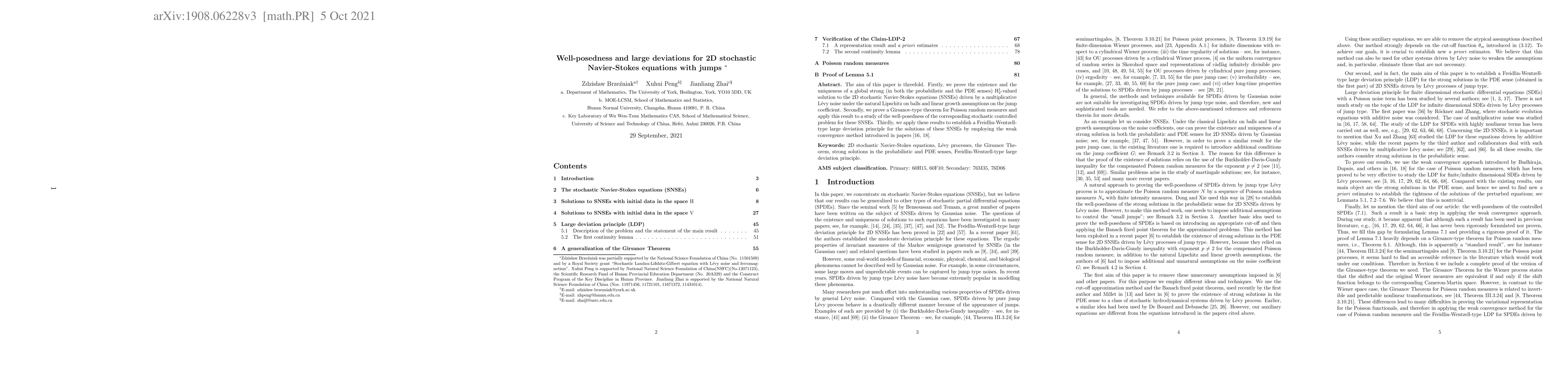 The aim of this paper is threefold. Firstly, we prove the existence and the uniqueness of a global strong (in both the probabilistic and the PDE senses) $\mathrm{H}^{1}_2$-valued solution to the 2D stochastic Navier-Stokes equations (SNSEs) driven by a multiplicative L\'evy noise under the natural Lipschitz on balls and linear growth assumptions on the jump coefficient. Secondly, we prove a Girsanov-type theorem for Poisson random measures and apply this result to a study of the well-posedness of the corresponding stochastic controlled problem for these SNSEs. Thirdly, we apply these results to establish a Freidlin-Wentzell-type large deviation principle for the solutions of these SNSEs by employing the weak convergence method introduced in papers [16][18].