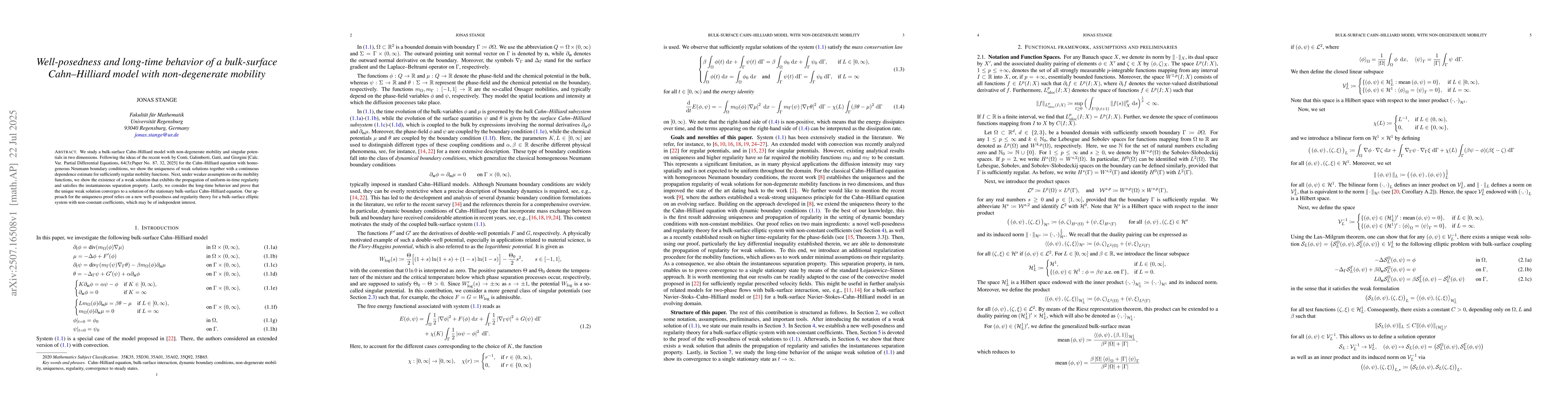 The work distinguishes itself by addressing a bulk-surface Cahn--Hilliard model with non-degenerate mobility, providing detailed proofs of uniqueness, existence, and long-time behavior, which are not commonly covered in existing literature focusing primarily on degenerate mobility cases.