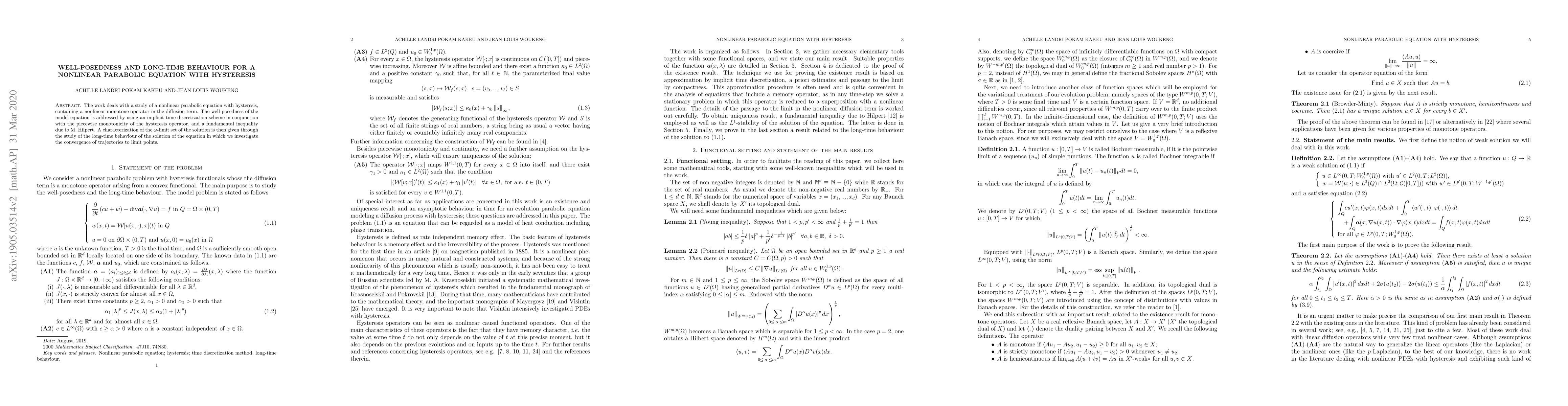 This paper investigates the well-posedness and long-term behavior of a nonlinear parabolic equation with hysteresis, proving existence and uniqueness via an implicit time discretization and M. Hilpert's inequality, and characterizing the solution's ω-limit set through its long-time convergence to limit points.