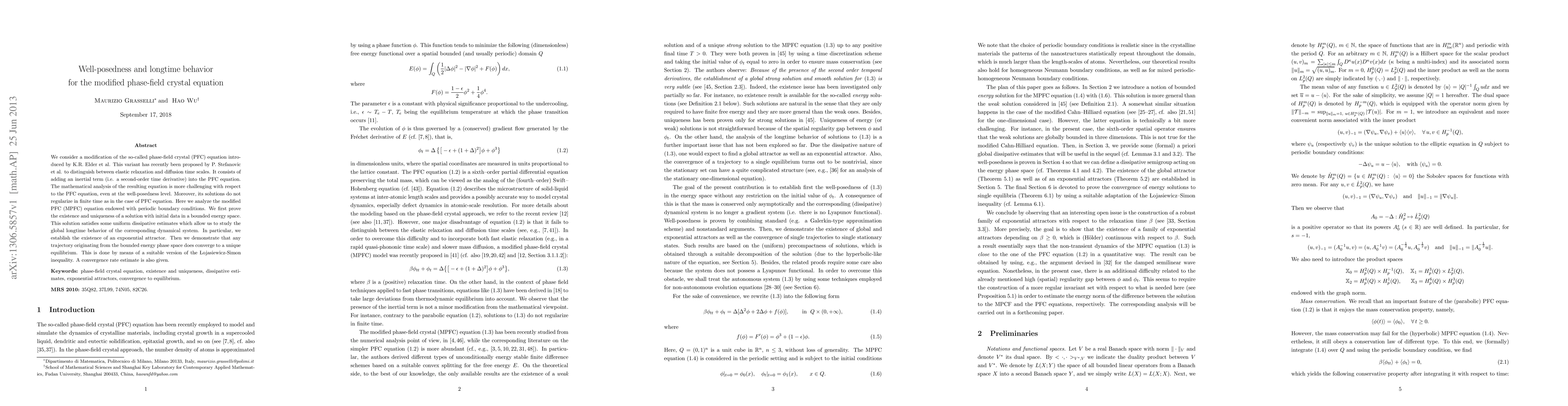 This paper investigates the well-posedness and longtime behavior of a modified phase-field crystal (MPFC) equation, which includes an inertial term. The authors prove existence and uniqueness of solutions and establish an exponential attractor, demonstrating convergence to a unique equilibrium state.