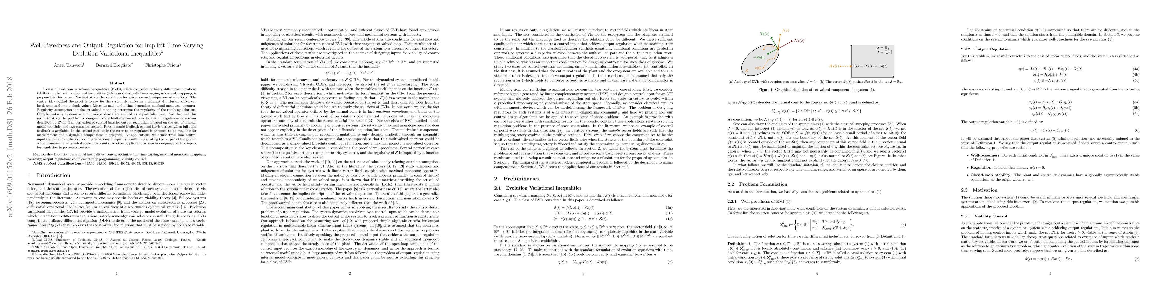 This paper proposes a class of evolution variational inequalities (EVIs) combining ODEs and variational inequalities, proving existence and uniqueness of solutions under specific conditions. It also develops state feedback control laws for output regulation using the internal model principle, demonstrating applications in regulating system outputs and designing control inputs for power converters.