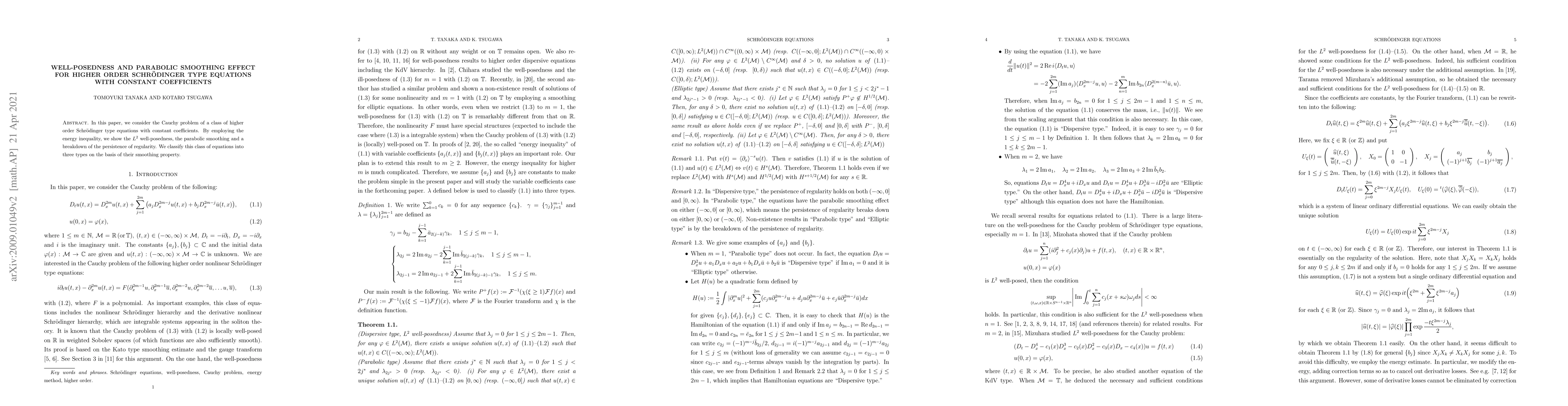 This paper investigates the Cauchy problem for higher order Schrödinger type equations with constant coefficients, demonstrating $L^2$ well-posedness, parabolic smoothing, and a breakdown of regularity persistence. The equations are classified into three types based on their smoothing properties.
