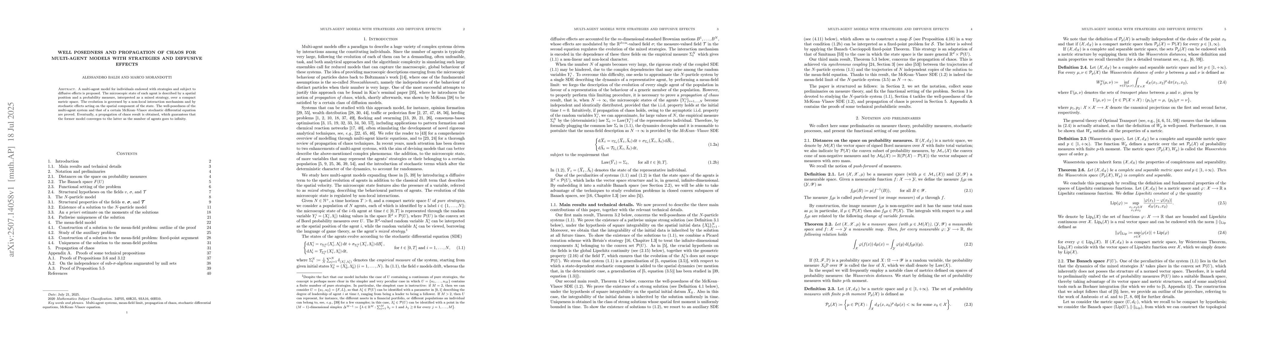 A multi-agent model for individuals endowed with strategies and subject to diffusive effects is proposed. The microscopic state of each agent is described by a spatial position and a probability measure, interpreted as a mixed strategy, over a compact metric space. The evolution is governed by a non-local interaction mechanism and by stochastic effects acting on the spatial component of the state. The well-posedness of the multi-agent system and that of a certain McKean--Vlasov stochastic differential equation are proved. Eventually, a propagation of chaos result is obtained, which guarantees that the former model converges to the latter as the number of agents goes to infinity.