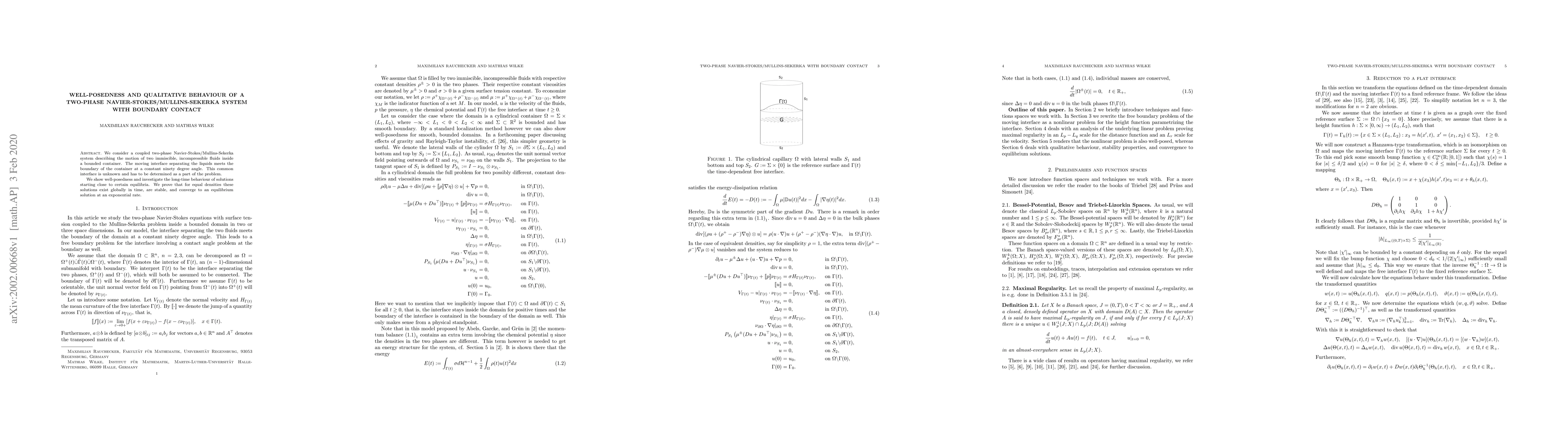 This study investigates a two-phase Navier-Stokes system with an unknown interface, showing that solutions exist globally in time for equal densities and converge to equilibrium at an exponential rate.