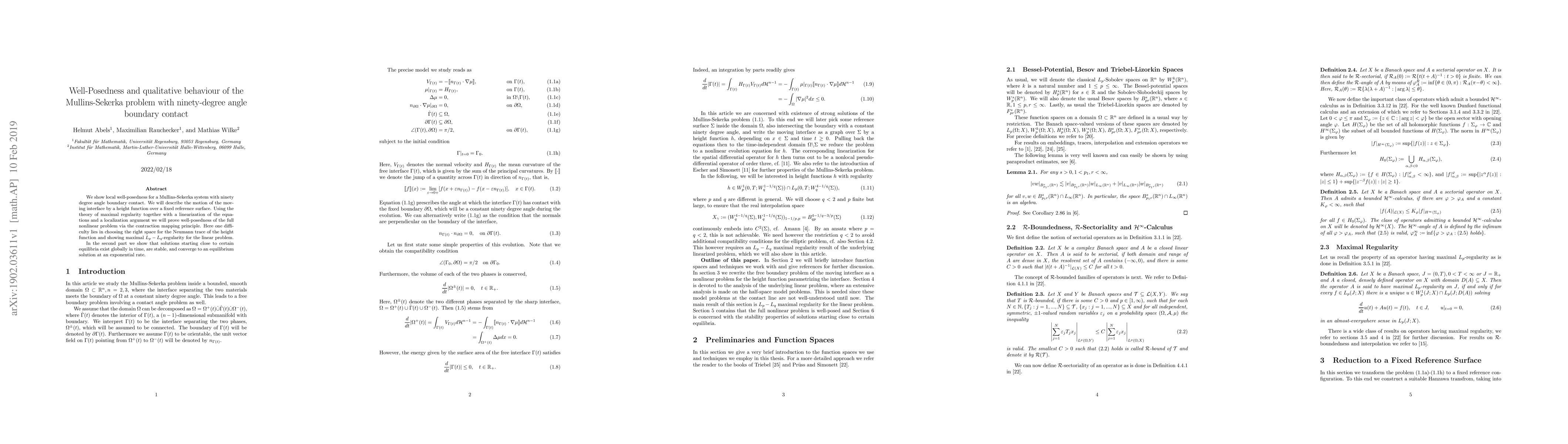 We show local well-posedness for the Mullins-Sekerka system with ninety degree angle boundary contact. We will describe the motion of the moving interface by a height function over a fixed reference surface. Using the theory of maximal regularity together with a linearization of the equations and a localization argument we will prove well-posedness of the full nonlinear problem via the contraction mapping principle. Here one difficulty lies in choosing the right space for the Neumann trace of the height function and showing maximal $L_p-L_q$-regularity for the linear problem. In the second part we show that solutions starting close to certain equilibria exist globally in time, are stable, and converge to an equilibrium solution at an exponential rate.