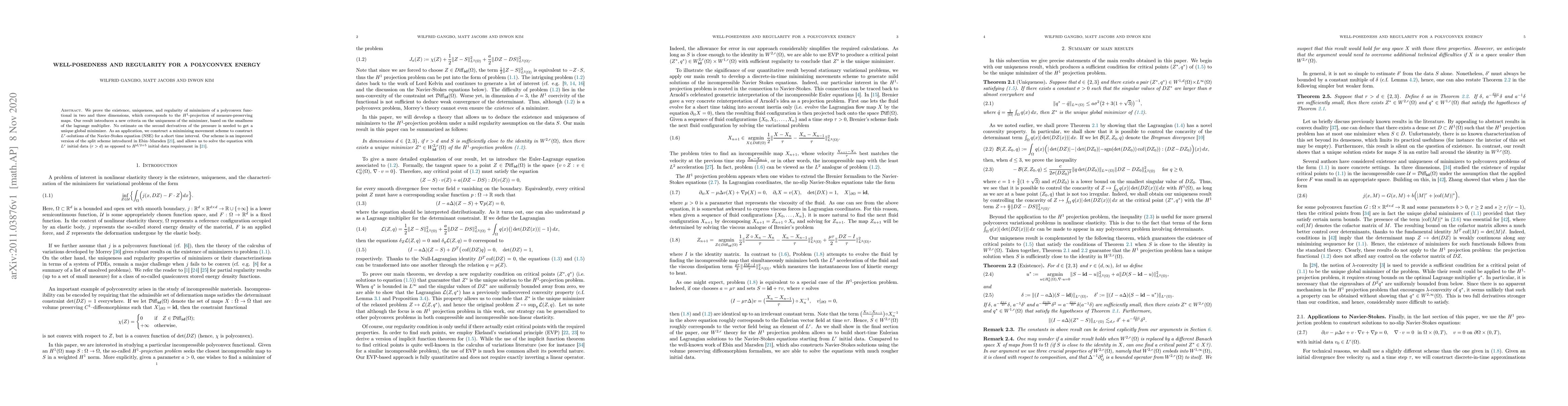 We prove the existence, uniqueness, and regularity of minimizers of a polyconvex functional in two and three dimensions, which corresponds to the $H^1$ projection of measure-preserving maps. Our result introduces a new criteria on the uniqueness of the minimizer, based on the smallness of the lagrange multiplier. No estimate on the second derivatives of the pressure is needed to get a unique global minimizer. As an application, we construct a minimizing movement scheme to construct $L^r$ solutions of the Navier-Stokes equation for a short time interval.
