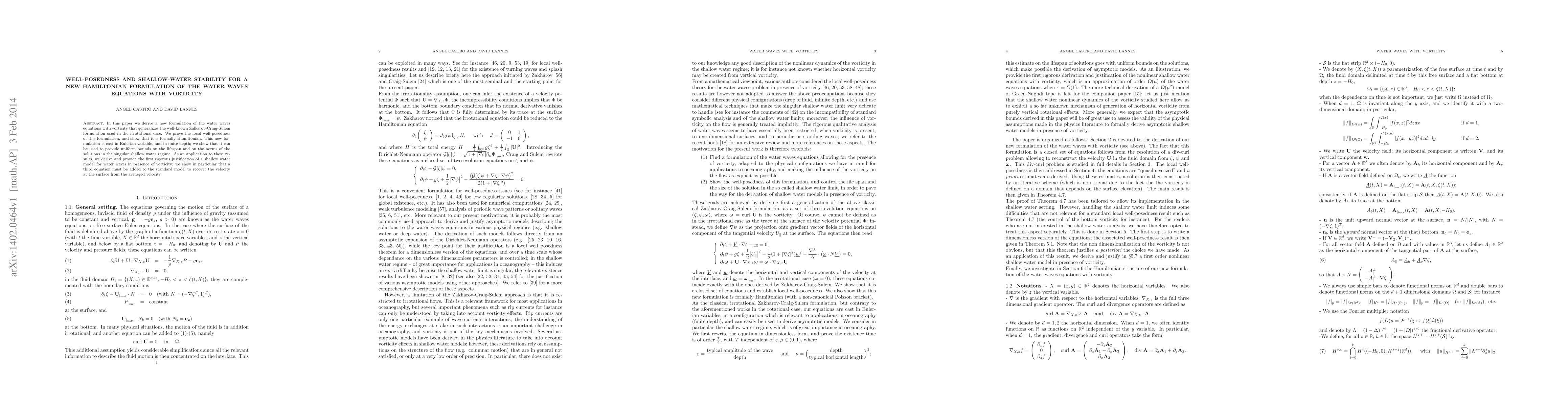 This paper introduces a new Hamiltonian formulation for water waves equations that includes vorticity, proving local well-posedness and demonstrating its Hamiltonian nature. It also provides a rigorous justification for a shallow water model with vorticity, showing the necessity of a third equation to recover surface velocity.