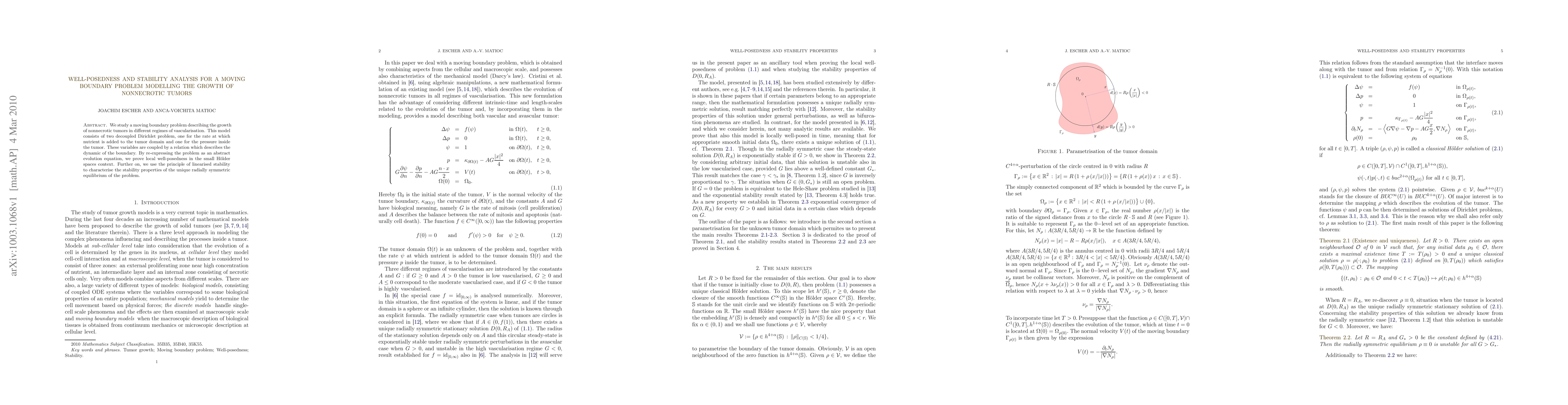 We study a moving boundary problem describing the growth of nonnecrotic tumors in different regimes of vascularisation. This model consists of two decoupled Dirichlet problem, one for the rate at which nutrient is added to the tumor domain and one for the pressure inside the tumor. These variables are coupled by a relation which describes the dynamic of the boundary. By re-expressing the problem as an abstract evolution equation, we prove local well-posedness in the small Hoelder spaces context. Further on, we use the principle of linearised stability to characterise the stability properties of the unique radially symmetric equilibrium of the problem.