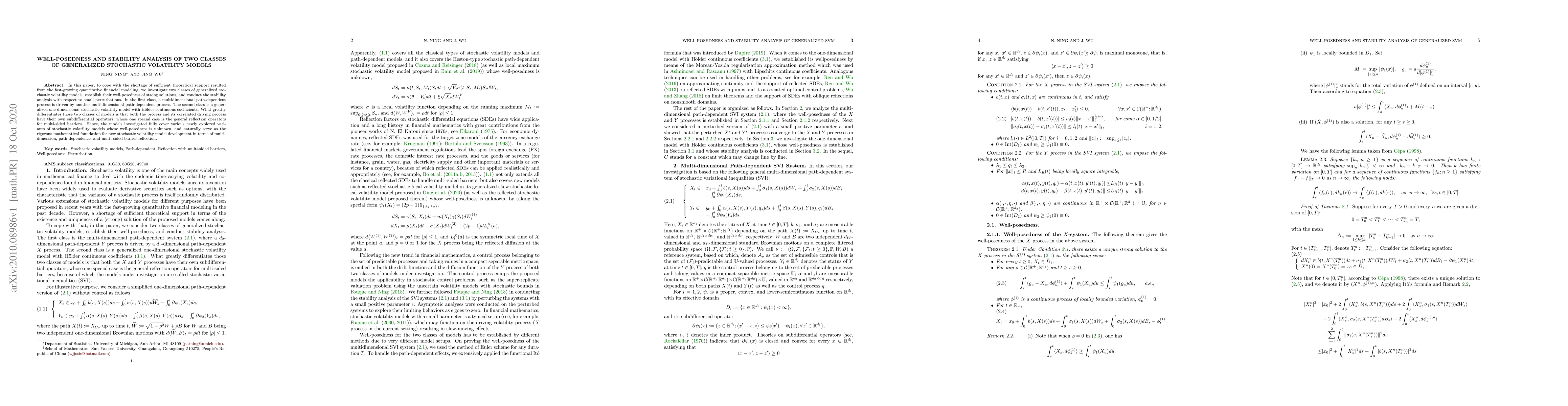 This paper investigates two classes of generalized stochastic volatility models, establishing their well-posedness and stability. It covers multidimensional path-dependent processes and one-dimensional models with H\"older continuous coefficients, providing a rigorous mathematical foundation for new stochastic volatility model development.