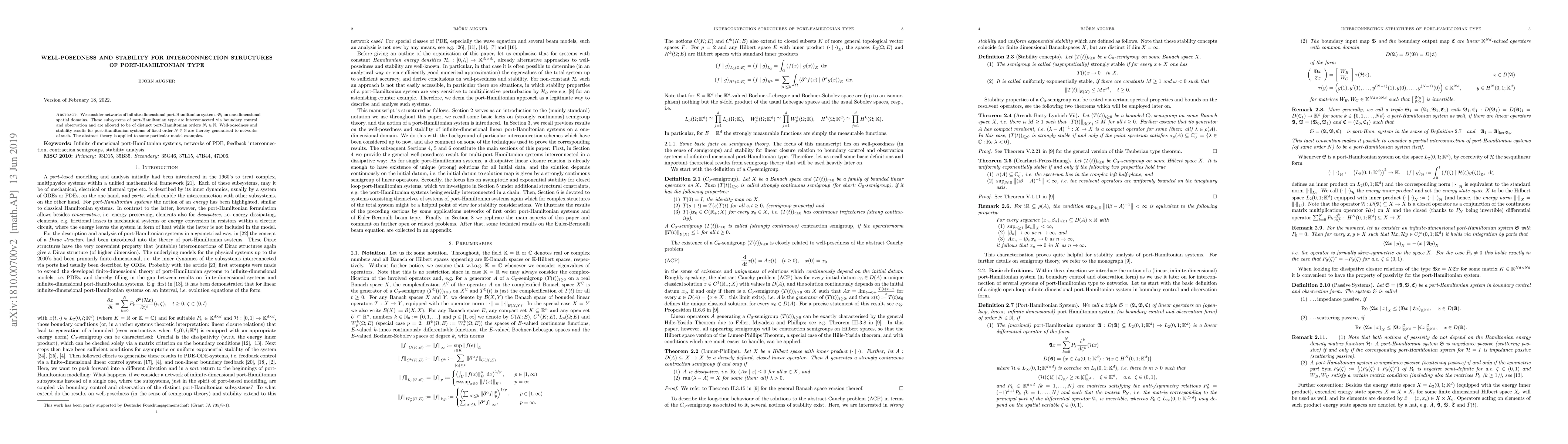 We consider networks of infinite-dimensional port-Hamiltonian systems $\mathfrak{S}_i$ on one-dimensional spatial domains. These subsystems of port-Hamiltonian type are interconnected via boundary control and observation and are allowed to be of distinct port-Hamiltonian orders $N_i \in \mathbb{N}$. Wellposedness and stability results for port-Hamiltonian systems of fixed order $N \in \mathbb{N}$ are thereby generalised to networks of such. The abstract theory is applied to some particular model examples.