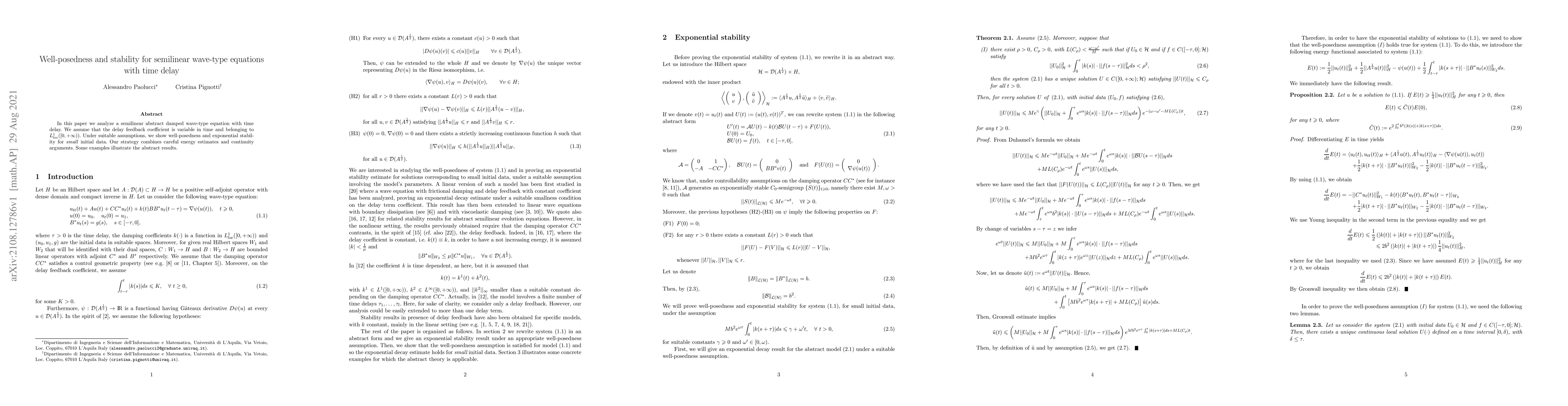 This paper investigates well-posedness and exponential stability for a semilinear wave-type equation with variable time delay. Using energy estimates and continuity arguments, it demonstrates these properties under suitable assumptions for small initial data, with examples illustrating the theoretical results.