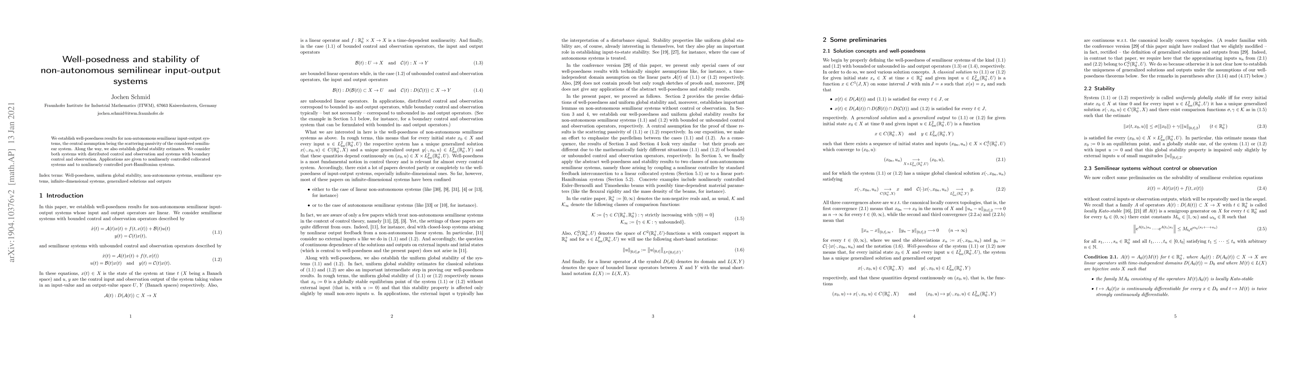 This paper establishes well-posedness and stability for non-autonomous semilinear input-output systems, assuming scattering-passivity. It covers both distributed and boundary control scenarios, with applications to collocated and port-Hamiltonian systems.