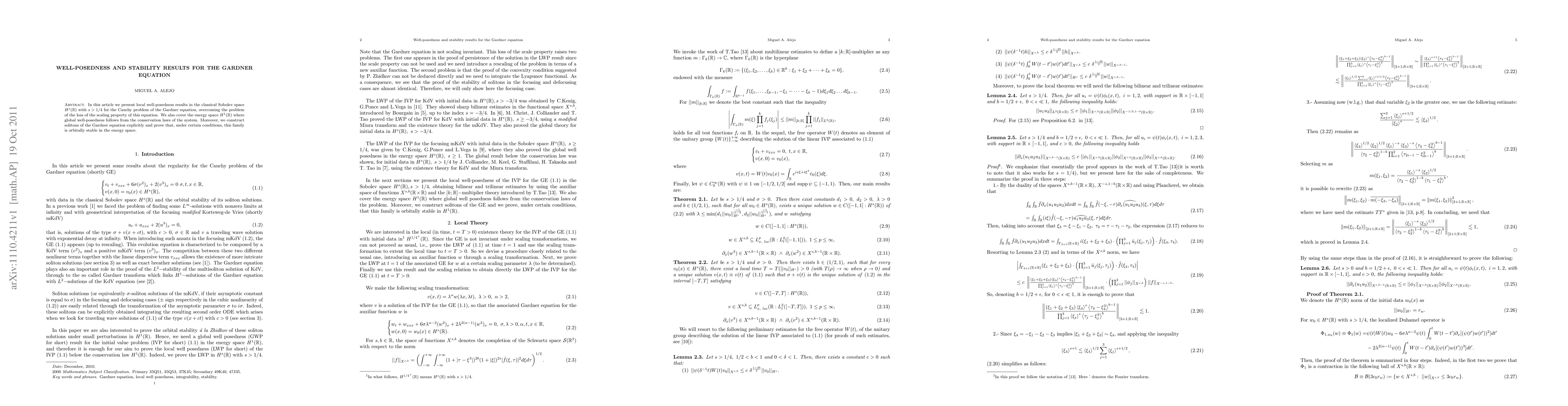 In this article we present local well-posedness results in the classical Sobolev space H^s(R) with s > 1/4 for the Cauchy problem of the Gardner equation, overcoming the problem of the loss of the scaling property of this equation. We also cover the energy space H^1(R) where global well-posedness follows from the conservation laws of the system. Moreover, we construct solitons of the Gardner equation explicitly and prove that, under certain conditions, this family is orbitally stable in the energy space.