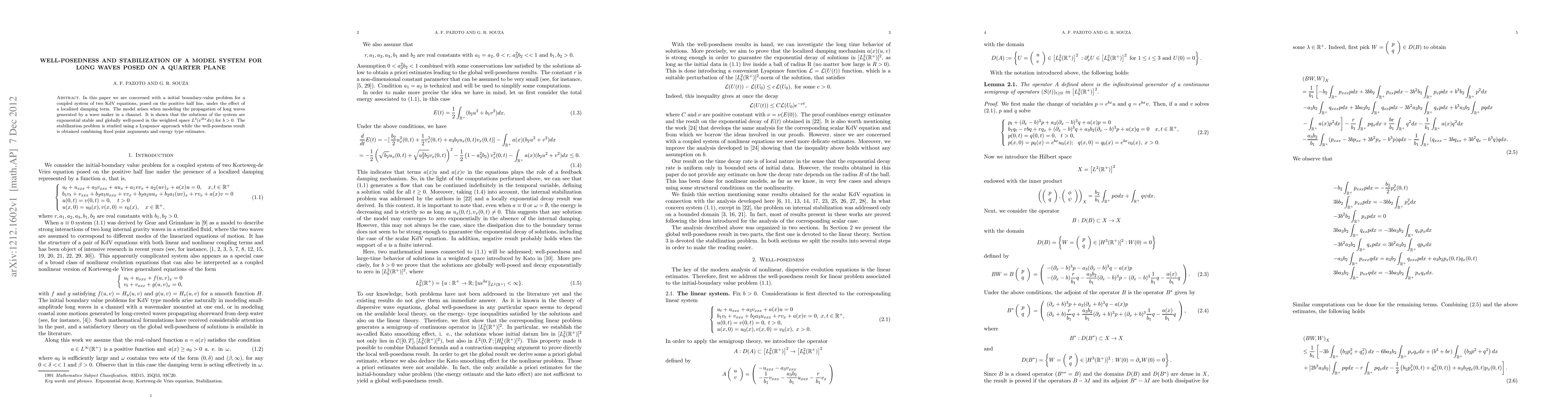 In this paper we are concerned with a initial boundary-value problem for a coupled system of two KdV equations, posed on the positive half line, under the effect of a localized damping term. The model arises when modeling the propagation of long waves generated by a wave maker in a channel. It is shown that the solutions of the system are exponential stable and globally well-posed in the weighted space $L^2(e^{2bx}dx)$ for $b>0$. The stabilization problem is studied using a Lyapunov approach while the well-posedness result is obtained combining fixed point arguments and energy type estimates.