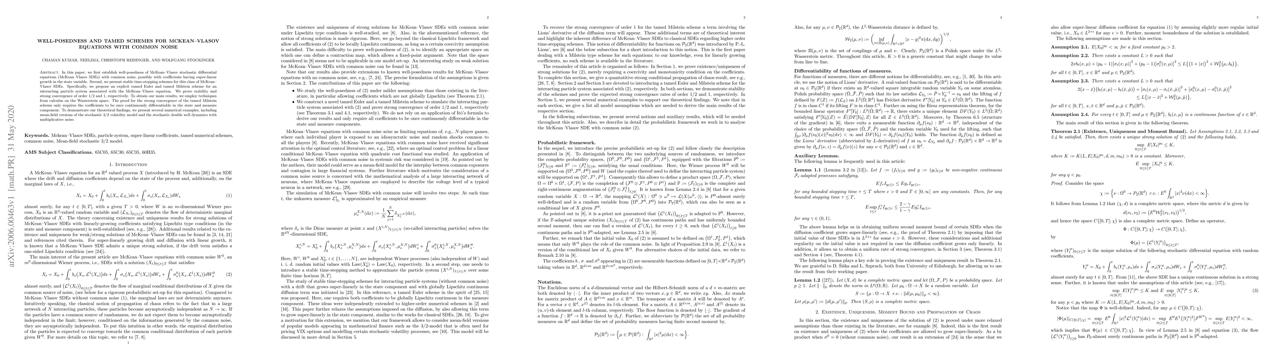 In this paper, we first establish well-posedness of McKean-Vlasov stochastic differential equations (McKean-Vlasov SDEs) with common noise, possibly with coefficients having super-linear growth in the state variable. Second, we present stable time-stepping schemes for this class of McKean-Vlasov SDEs. Specifically, we propose an explicit tamed Euler and tamed Milstein scheme for an interacting particle system associated with the McKean-Vlasov equation. We prove stability and strong convergence of order $1/2$ and $1$, respectively. To obtain our main results, we employ techniques from calculus on the Wasserstein space. The proof for the strong convergence of the tamed Milstein scheme only requires the coefficients to be once continuously differentiable in the state and measure component. To demonstrate our theoretical findings, we present several numerical examples, including mean-field versions of the stochastic $3/2$ volatility model and the stochastic double well dynamics with multiplicative noise.