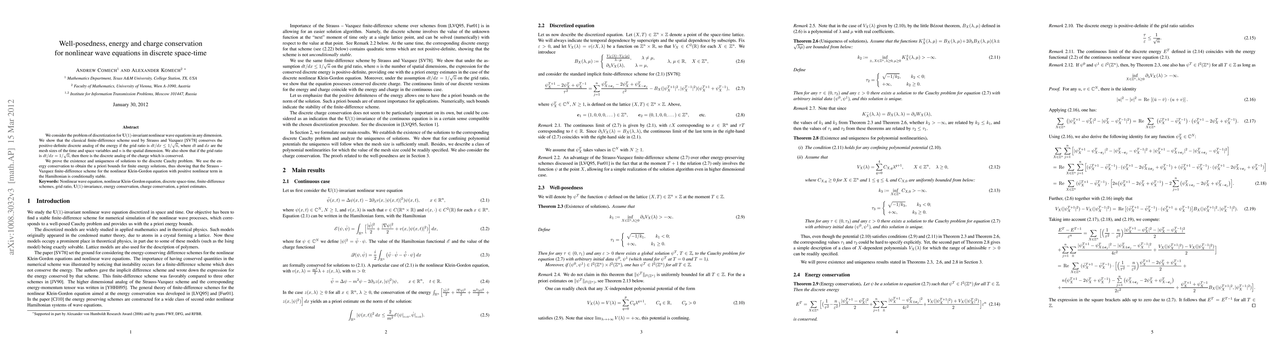 We consider the problem of discretization for the U(1)-invariant nonlinear wave equations in any dimension. We show that the classical finite-difference scheme used by Strauss and Vazquez \cite{MR0503140} conserves the positive-definite discrete analog of the energy if the grid ratio is $dt/dx\le 1/\sqrt{n}$, where $dt$ and $dx$ are the mesh sizes of the time and space variables and $n$ is the spatial dimension. We also show that if the grid ratio is $dt/dx=1/\sqrt{n}$, then there is the discrete analog of the charge which is conserved. We prove the existence and uniqueness of solutions to the discrete Cauchy problem. We use the energy conservation to obtain the a priori bounds for finite energy solutions, thus showing that the Strauss -- Vazquez finite-difference scheme for the nonlinear Klein-Gordon equation with positive nonlinear term in the Hamiltonian is conditionally stable.
