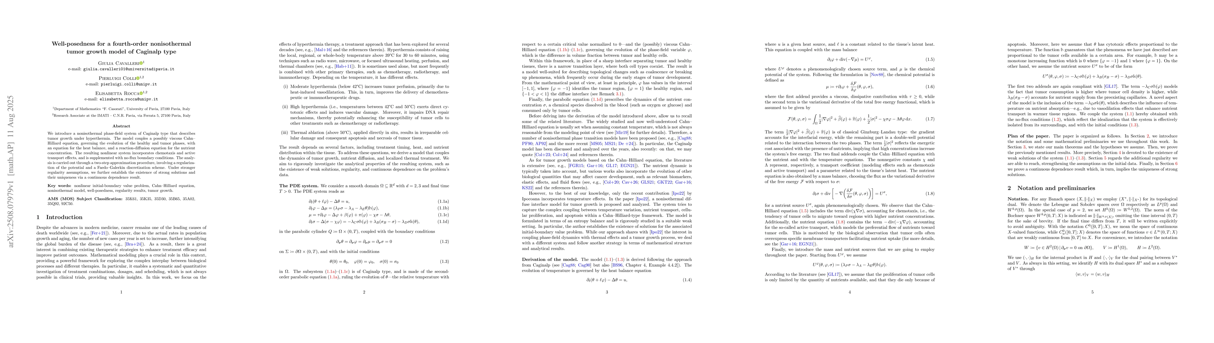 We introduce a nonisothermal phase-field system of Caginalp type that describes tumor growth under hyperthermia. The model couples a possibly viscous Cahn-Hilliard equation, governing the evolution of the healthy and tumor phases, with an equation for the heat balance, and a reaction-diffusion equation for the nutrient concentration. The resulting nonlinear system incorporates chemotaxis and active transport effects, and is supplemented with no-flux boundary conditions. The analysis is carried out through a two-step approximation procedure, involving a regularization of the potential and a Faedo-Galerkin discretization scheme. Under stronger regularity assumptions, we further establish the existence of strong solutions and their uniqueness via a continuous dependence result.