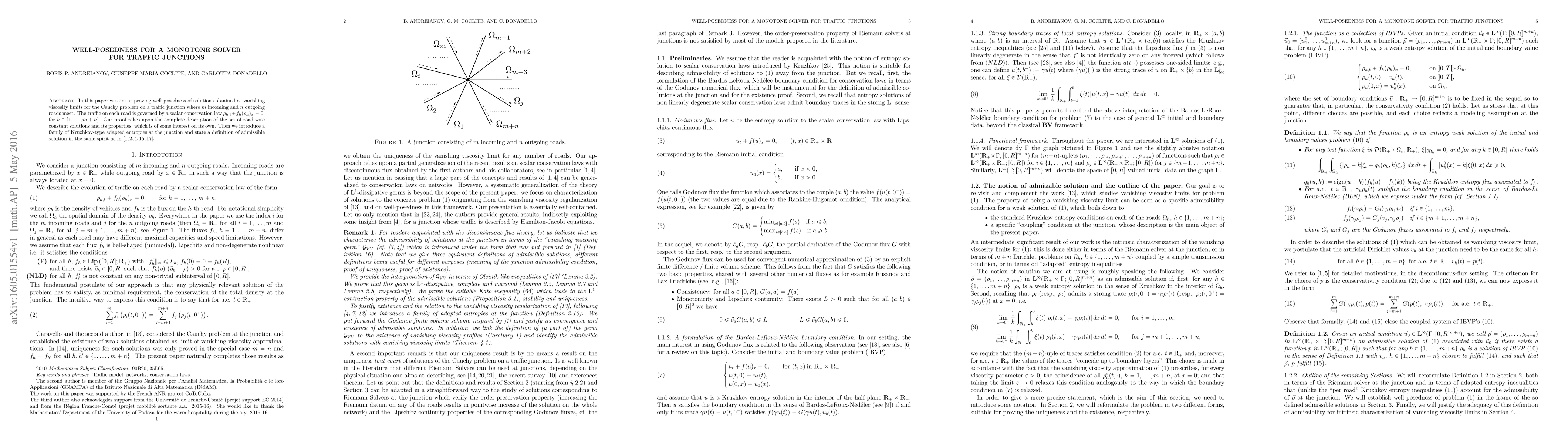 In this paper we aim at proving well-posedness of solutions obtained as vanishing viscosity limits for the Cauchy problem on a traffic junction where $m$ incoming and $n$ outgoing roads meet. The traffic on each road is governed by a scalar conservation law $ \rho_{h,t} + f_h(\rho_h)_x = 0$, for $h\in \{1,\ldots, m+n\}$. Our proof relies upon the complete description of the set of road-wise constant solutions and its properties, which is of some interest on its own. Then we introduce a family of Kruzhkov-type adapted entropies at the junction and state a definition of admissible solution in the same spirit as in \cite{diehl, ColomboGoatinConstraint, scontrainte, AC_transmission, germes}.
