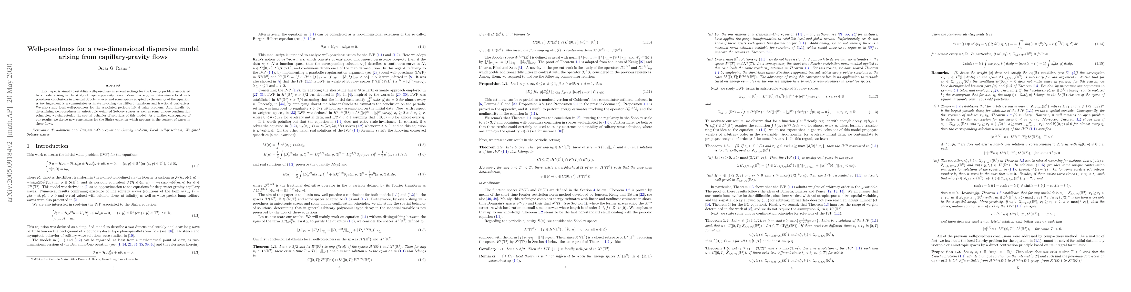 This paper establishes local well-posedness for a two-dimensional dispersive model from capillary-gravity flows in various function spaces, utilizing a commutator estimate involving the Hilbert transform and fractional derivatives. It also characterizes the spatial behavior of solutions and derives new results for the Shrira equation.