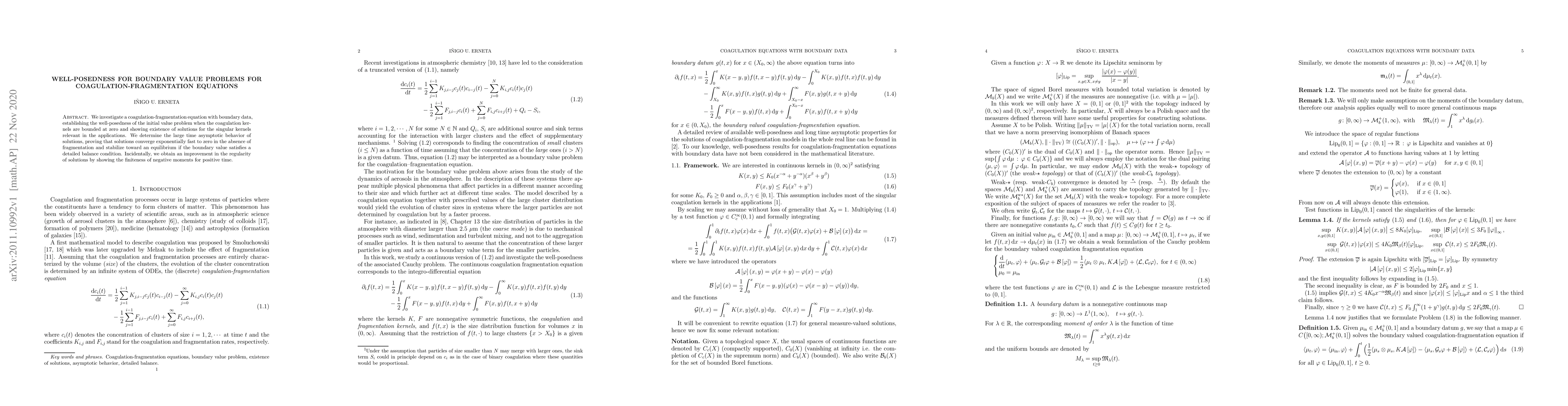 This paper establishes well-posedness for coagulation-fragmentation equations with boundary data, proving exponential convergence to zero without fragmentation and stabilization towards equilibrium under detailed balance conditions. It also improves solution regularity by demonstrating finiteness of negative moments.