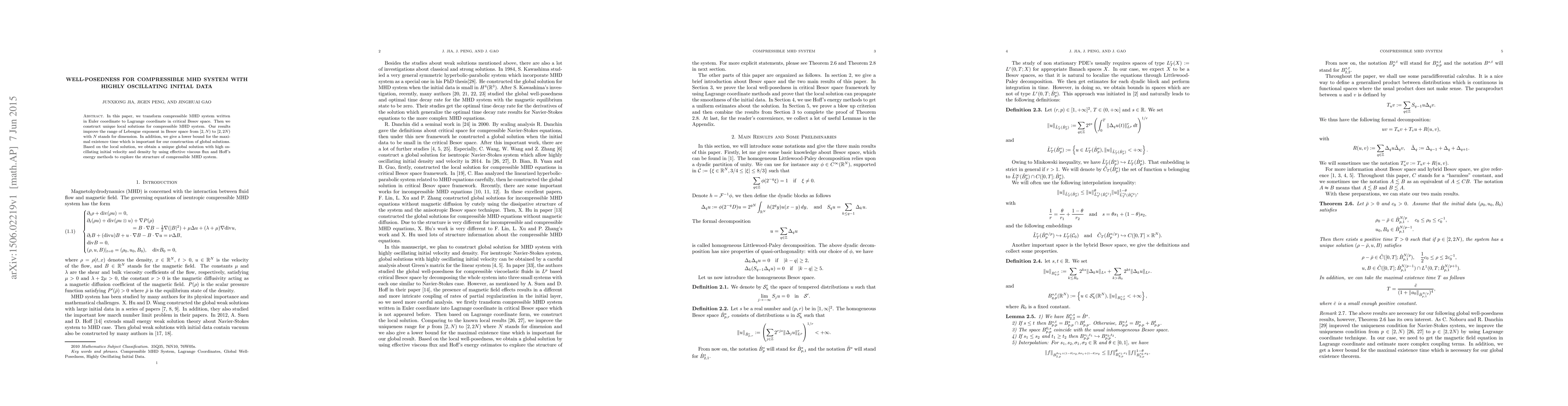 This paper constructs unique local and global solutions for the compressible magnetohydrodynamic (MHD) system in Lagrange coordinates, transforming it from Euler coordinates. It improves the range of Lebesgue exponent in Besov space and provides a lower bound for maximal existence time, ultimately achieving global solutions with highly oscillating initial data.