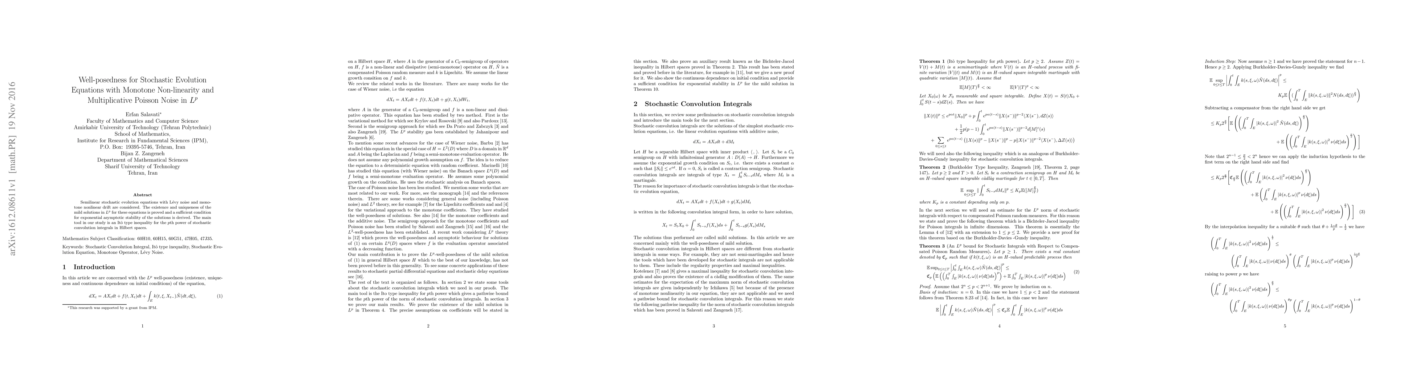 The main technical contribution is the development and application of an Itô type inequality for stochastic convolution integrals in Hilbert spaces, which enables the proof of existence, uniqueness, and stability of mild solutions in $L^p$ for $p \geq 2$.