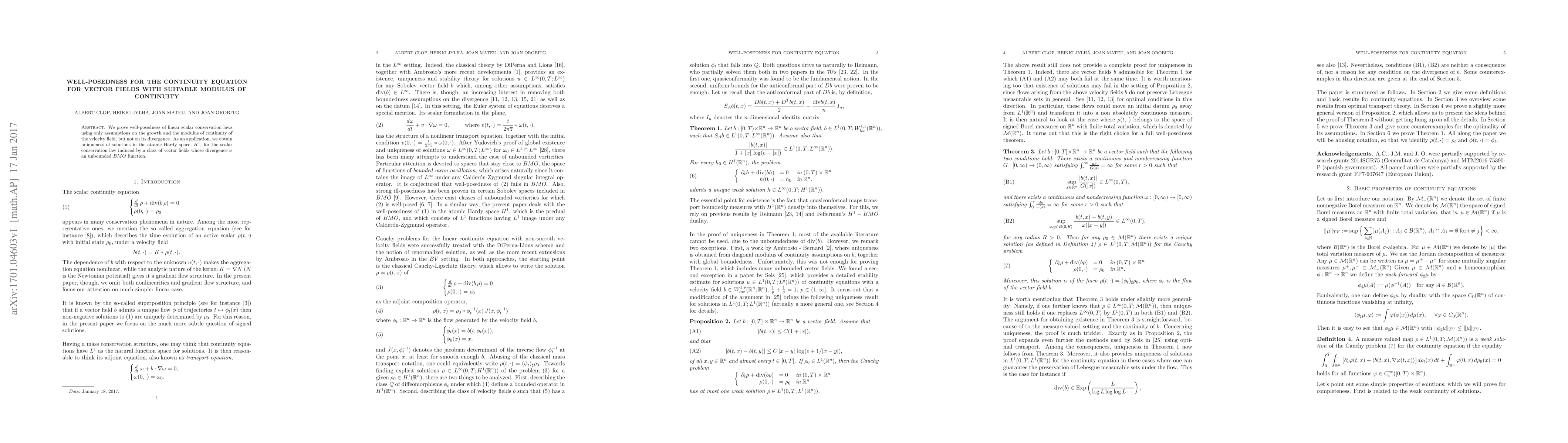 This paper proves well-posedness of linear scalar conservation laws using only growth and modulus of continuity assumptions on the velocity field, not its divergence. It also demonstrates uniqueness in solutions for certain vector fields in specific function spaces.
