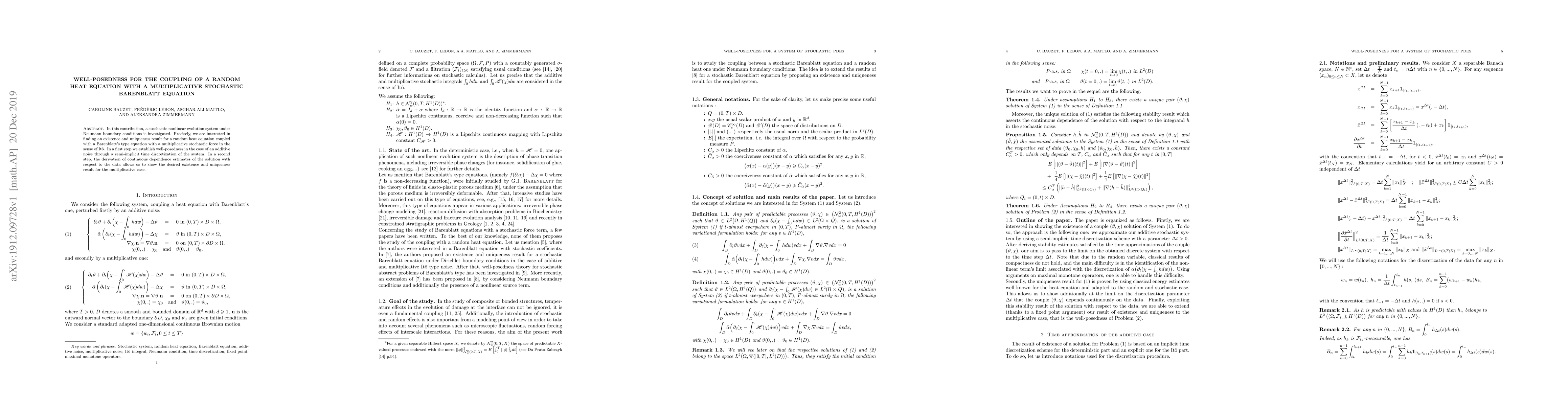 This paper investigates the well-posedness of a stochastic nonlinear evolution system involving a random heat equation coupled with a multiplicative stochastic Barenblatt equation under Neumann boundary conditions. It first establishes well-posedness for the additive noise case using semi-implicit time discretization, then extends the results to the multiplicative noise scenario through continuous dependence estimates.