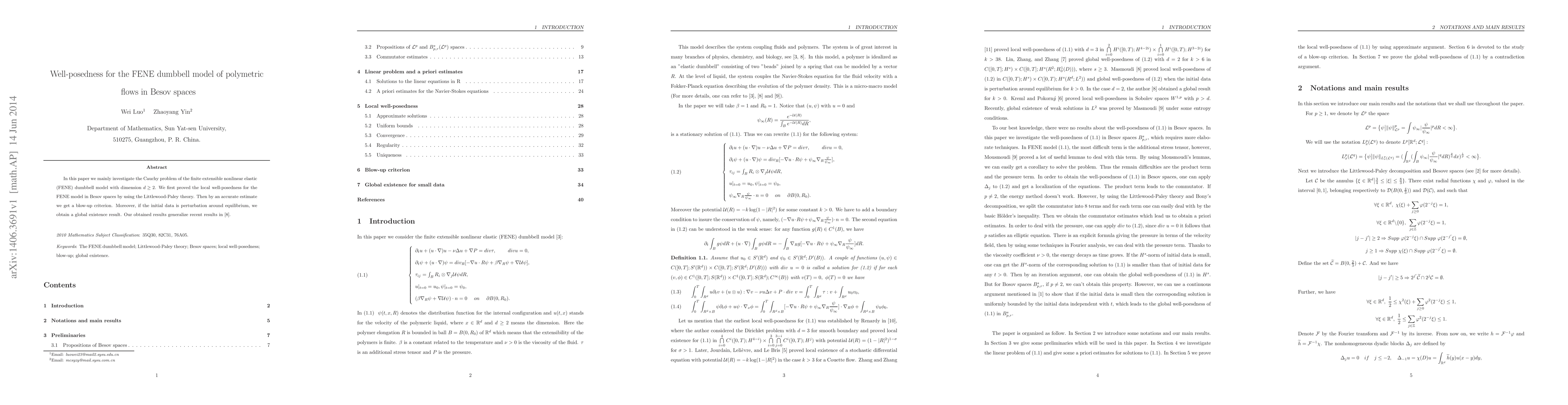 This paper investigates the Cauchy problem for the FENE dumbbell model in Besov spaces, proving local well-posedness using Littlewood-Paley theory and establishing a blow-up criterion. Global existence is shown for initial data near equilibrium, extending previous results.