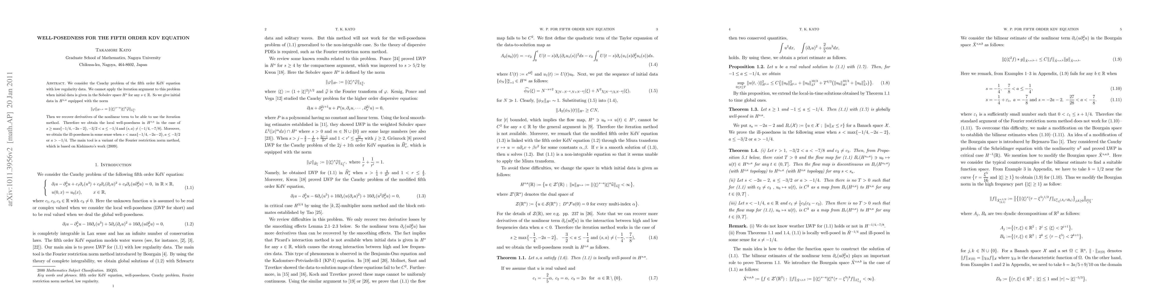 This paper establishes the local well-posedness for the fifth order KdV equation with low regularity initial data in the space $H^{s,a}$. The authors utilize the Fourier restriction norm method to achieve this result, which is optimal under certain conditions.