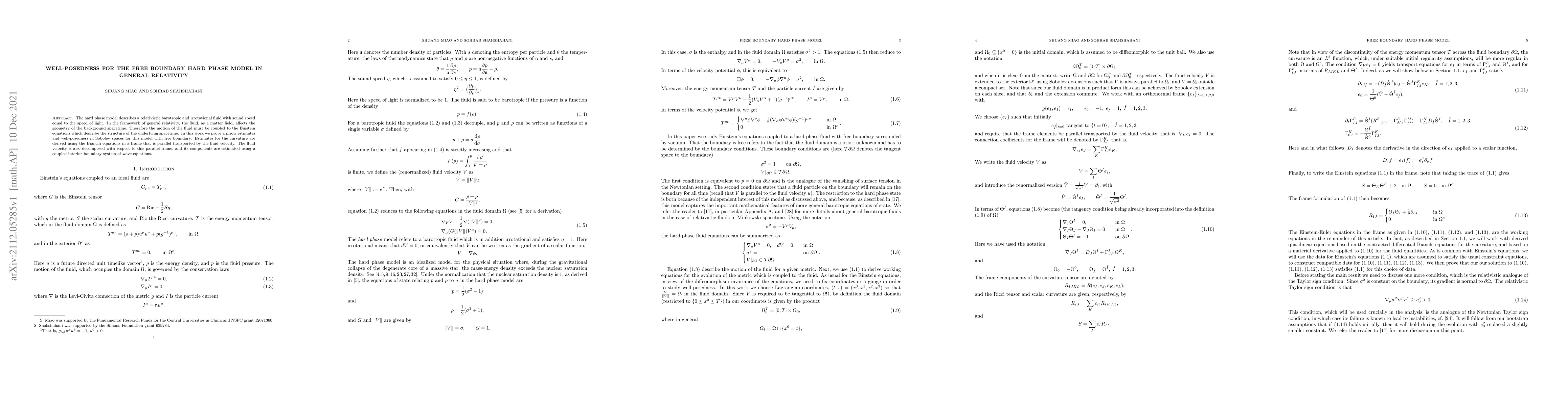 This paper proves well-posedness and a priori estimates for the free boundary hard phase model in general relativity, where a relativistic fluid affects spacetime geometry. The authors utilize the Bianchi equations and a parallel transported frame to derive curvature estimates and decompose the fluid velocity into components governed by a coupled wave system.