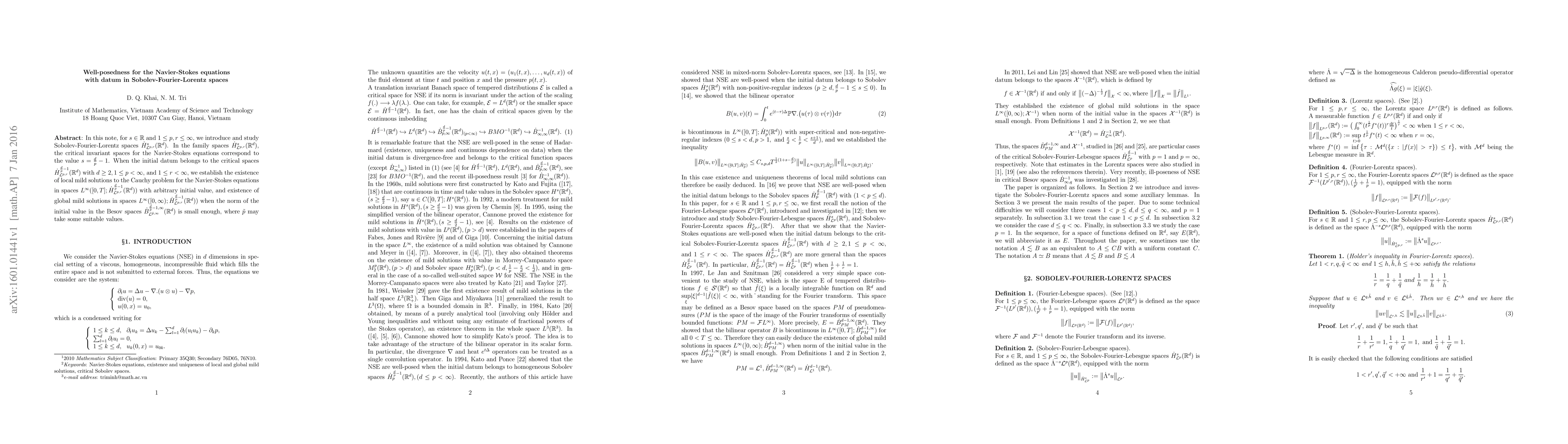In this note, for $s \in \mathbb R$ and $1 \leq p, r \leq \infty$, we introduce and study Sobolev-Fourier-Lorentz spaces $\dot{H}^s_{\mathcal{L}^{p, r}}(\mathbb{R}^d)$. In the family spaces $\dot{H}^s_{\mathcal{L}^{p, r}}(\mathbb{R}^d)$, the critical invariant spaces for the Navier-Stokes equations correspond to the value $s = \frac{d}{p} - 1$. When the initial datum belongs to the critical spaces $\dot{H}^{\frac{d}{p} - 1}_{\mathcal{L}^{p,r}}(\mathbb{R}^d)$ with $d \geq 2, 1 \leq p <\infty$, and $1 \leq r < \infty$, we establish the existence of local mild solutions to the Cauchy problem for the Navier-Stokes equations in spaces $L^\infty([0, T]; \dot{H}^{\frac{d}{p} - 1}_{\mathcal{L}^{p, r}}(\mathbb{R}^d))$ with arbitrary initial value, and existence of global mild solutions in spaces $L^\infty([0, \infty); \dot{H}^{\frac{d}{p} - 1}_{\mathcal{L}^{p, r}}(\mathbb{R}^d))$ when the norm of the initial value in the Besov spaces $\dot{B}^{\frac{d}{\tilde p} - 1, \infty}_{\mathcal{L} ^{\tilde p,\infty}}(\mathbb{R}^d)$ is small enough, where $\tilde p$ may take some suitable values.