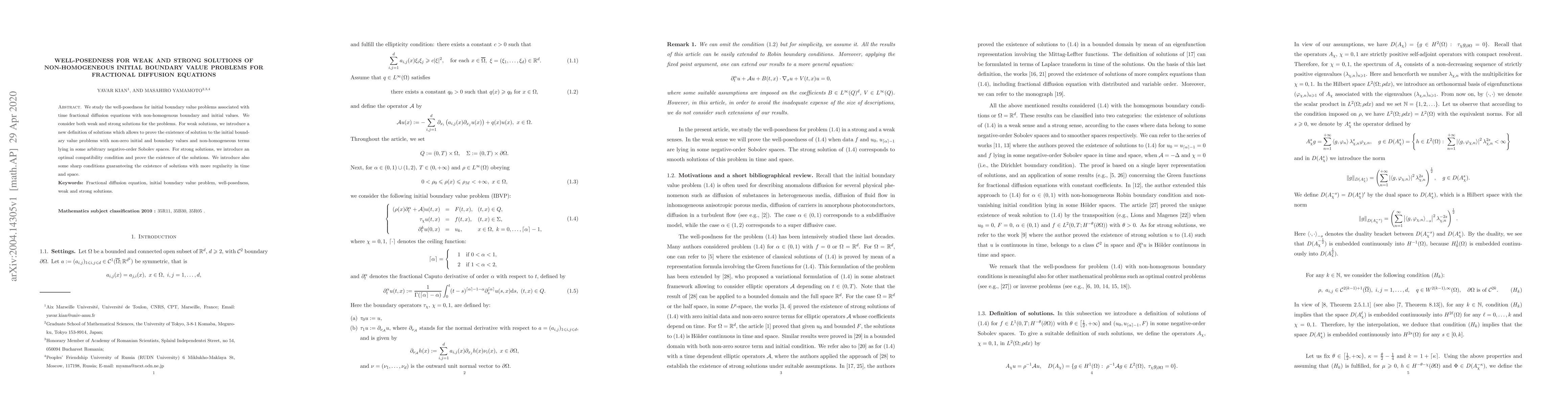 This paper investigates the well-posedness of initial boundary value problems for fractional diffusion equations with non-homogeneous initial and boundary conditions. It introduces new definitions for weak solutions and optimal conditions for strong solutions, proving existence and regularity for both types.