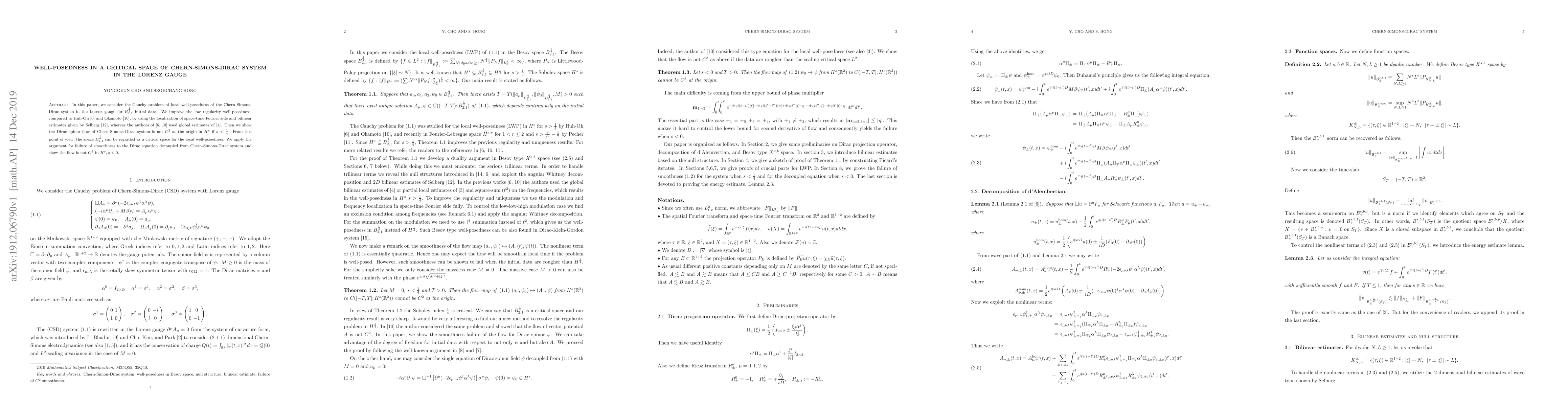 In this paper, we consider the Cauchy problem of local well-posedness of the Chern-Simons-Dirac system in the Lorenz gauge for $B^{\frac14}_{2,1}$ initial data. We improve the low regularity well-posedness, compared to Huh-Oh \cite{huhoh} and Okamoto \cite{oka}, by using the localization of space-time Fourier side and bilinear estimates given by Selberg \cite{selb}, whereas the authors of \cite{huhoh, oka} used global estimates of \cite{danfoselb}. Then we show the Dirac spinor flow of Chern-Simons-Dirac system is not $C^2$ at the origin in $H^s$ if $ s < \frac14$. From this point of view, the space $B_{2,1}^\frac14$ can be regarded as a critical space for the local well-posedness. We apply the argument for failure of smoothness to the Dirac equation decoupled from Chern-Simons-Dirac system and show the flow is not $C^3$ in $H^s, s < 0$.