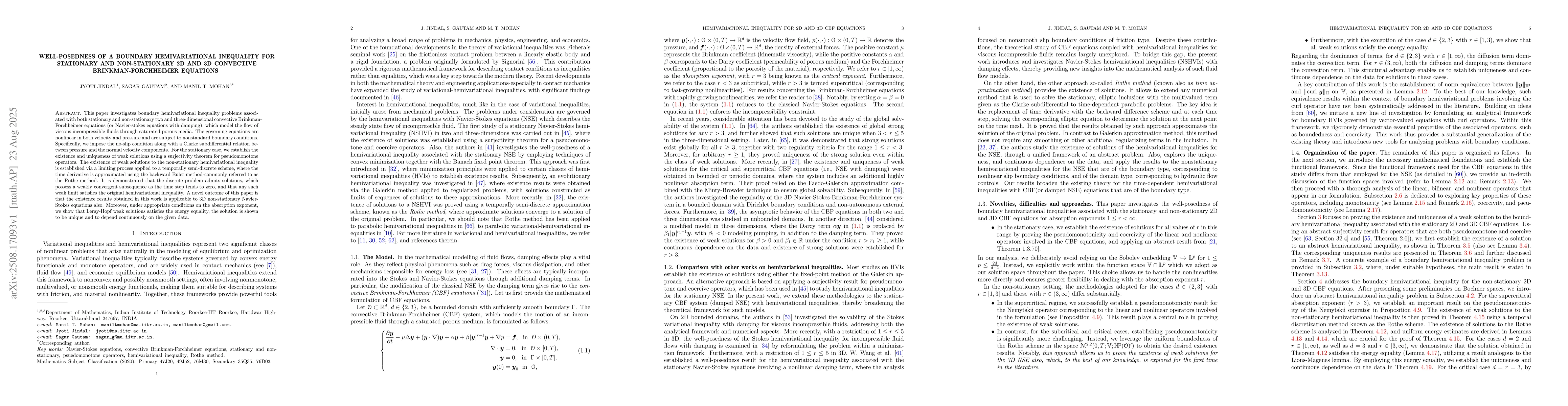 This paper investigates boundary hemivariational inequality problems associated with both stationary and non-stationary two and three-dimensional convective Brinkman-Forchheimer equations (or Navier-stokes equations with damping), which model the flow of viscous incompressible fluids through saturated porous media. The governing equations are nonlinear in both velocity and pressure and are subject to nonstandard boundary conditions. Specifically, we impose the no-slip condition along with a Clarke subdifferential relation between pressure and the normal velocity components. For the stationary case, we establish the existence and uniqueness of weak solutions using a surjectivity theorem for pseudomonotone operators. The existence of weak solutions to the non-stationary hemivariational inequality is established via a limiting process applied to a temporally semi-discrete scheme, where the time derivative is approximated using the backward Euler method-commonly referred to as the Rothe method. It is demonstrated that the discrete problem admits solutions, which possess a weakly convergent subsequence as the time step tends to zero, and that any such weak limit satisfies the original hemivariational inequality. A novel outcome of this paper is that the existence results obtained in this work is applicable to 3D non-stationary Navier-Stokes equations also. Moreover, under appropriate conditions on the absorption exponent, we show that Leray-Hopf weak solutions satisfies the energy equality, the solution is shown to be unique and to depend continuously on the given data.