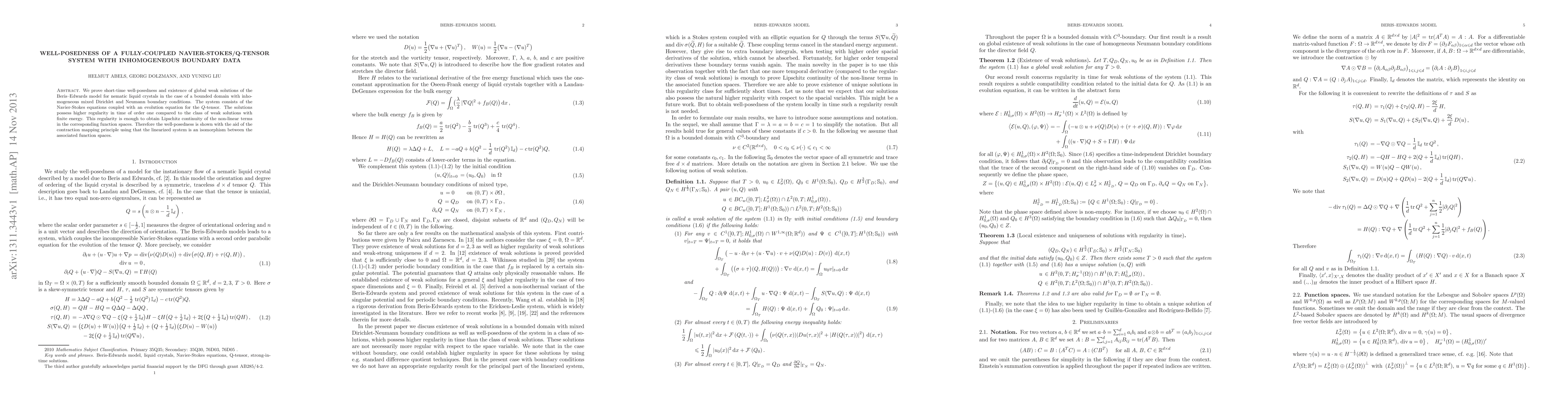 We prove short-time well-posedness and existence of global weak solutions of the Beris--Edwards model for nematic liquid crystals in the case of a bounded domain with inhomogeneous mixed Dirichlet and Neumann boundary conditions. The system consists of the Navier-Stokes equations coupled with an evolution equation for the $Q$-tensor. The solutions possess higher regularity in time of order one compared to the class of weak solutions with finite energy. This regularity is enough to obtain Lipschitz continuity of the non-linear terms in the corresponding function spaces. Therefore the well-posedness is shown with the aid of the contraction mapping principle using that the linearized system is an isomorphism between the associated function spaces.