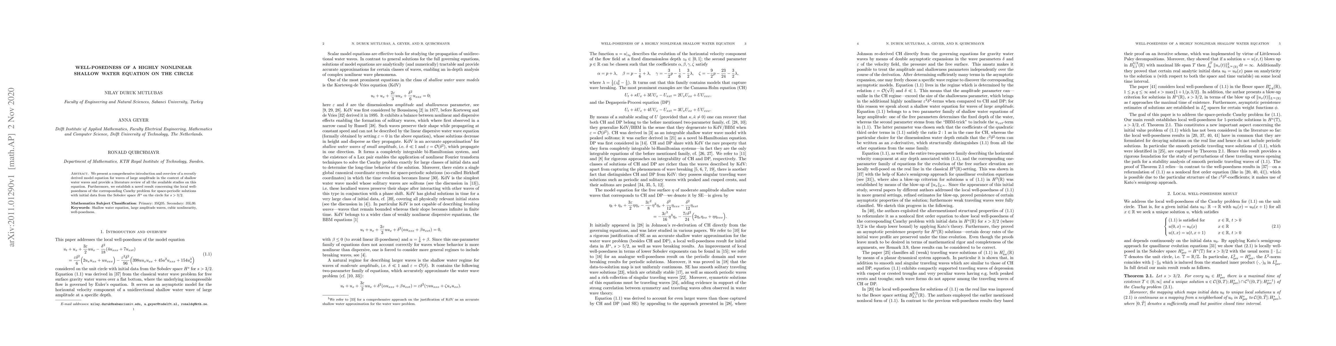 This paper reviews a newly derived nonlinear shallow water equation and establishes local well-posedness for its Cauchy problem, proving solutions exist for space-periodic initial data in the Sobolev space $H^s$ with $s>3/2$ on the circle.